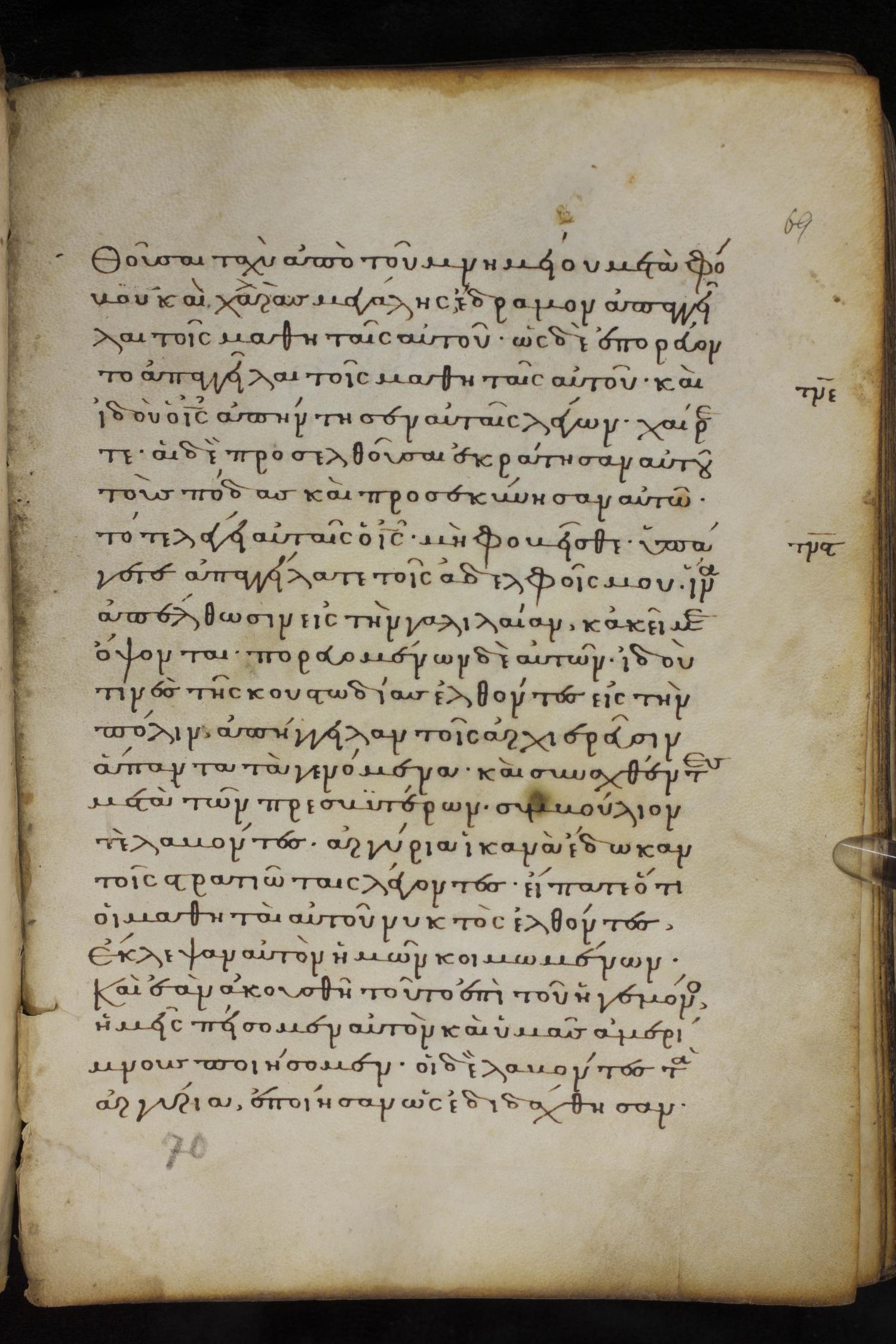 Thirteenth century minuscule of the Gospels on parchment; 237 leaves, 1 column, 23 lines per column. Images were taken at the National Library of Greece in Athens.