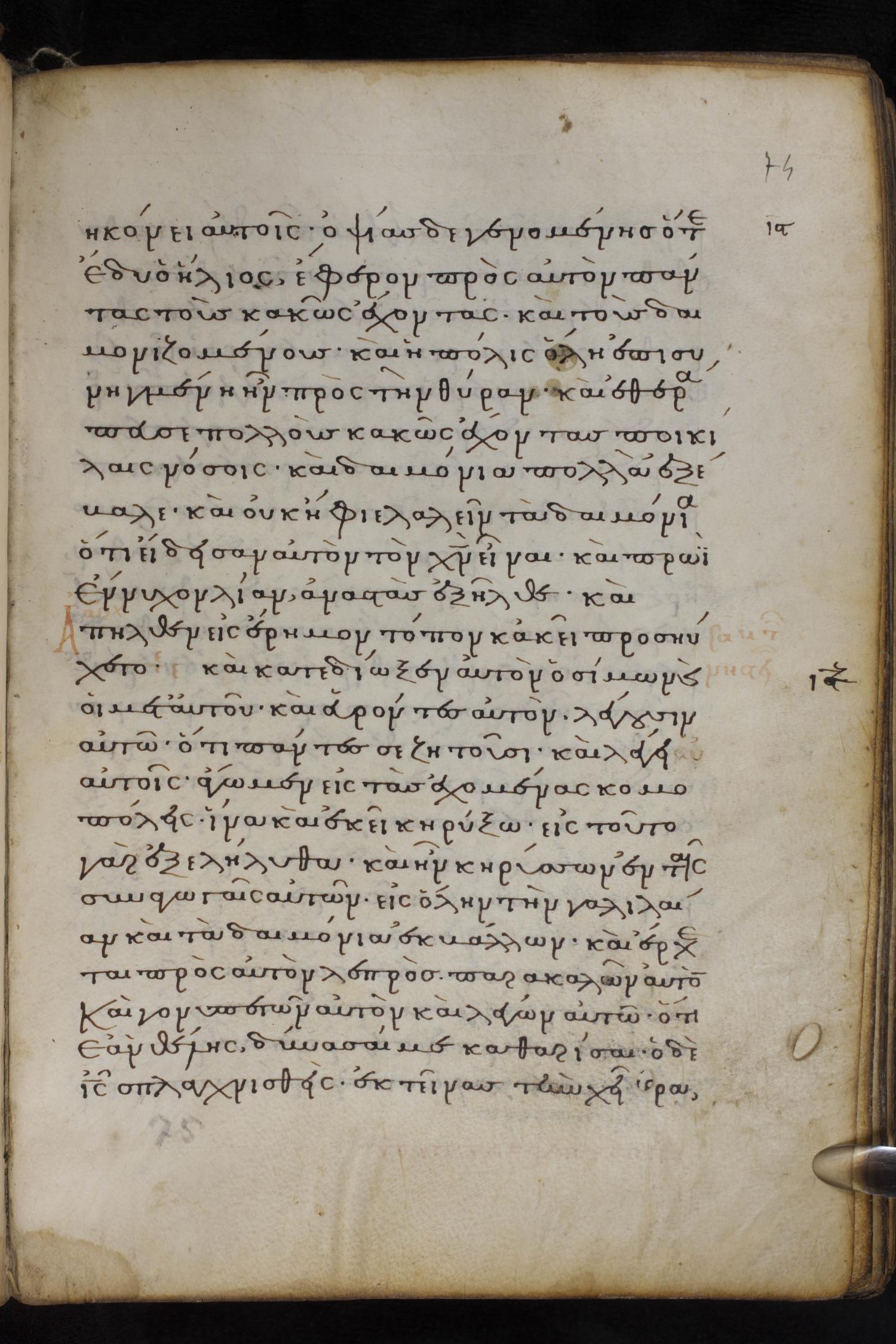Thirteenth century minuscule of the Gospels on parchment; 237 leaves, 1 column, 23 lines per column. Images were taken at the National Library of Greece in Athens.