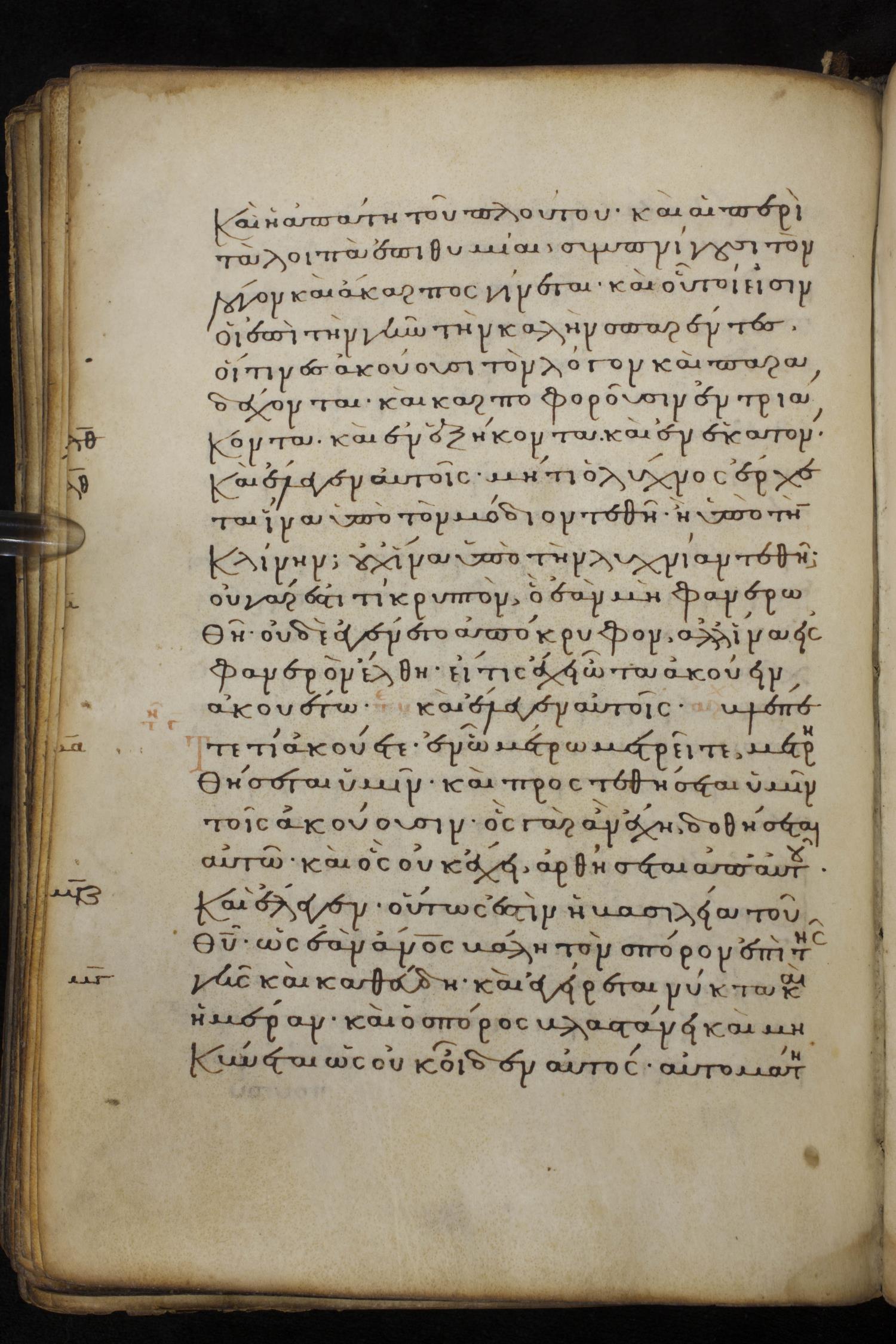 Thirteenth century minuscule of the Gospels on parchment; 237 leaves, 1 column, 23 lines per column. Images were taken at the National Library of Greece in Athens.
