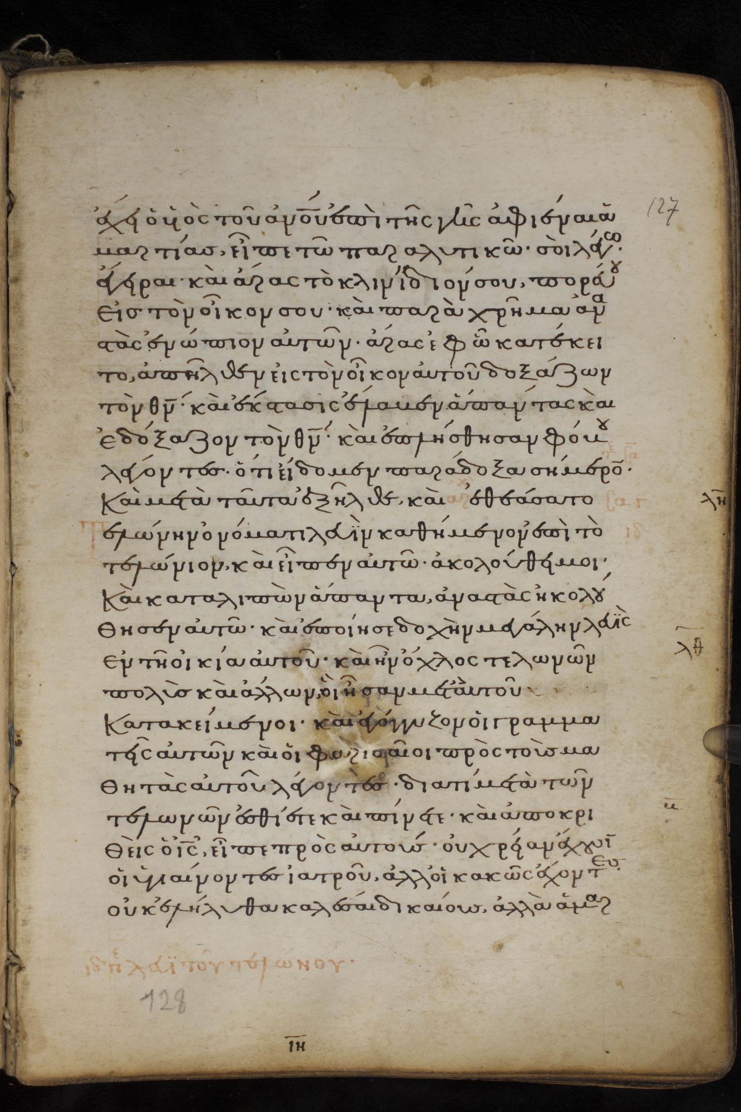 Thirteenth century minuscule of the Gospels on parchment; 237 leaves, 1 column, 23 lines per column. Images were taken at the National Library of Greece in Athens.