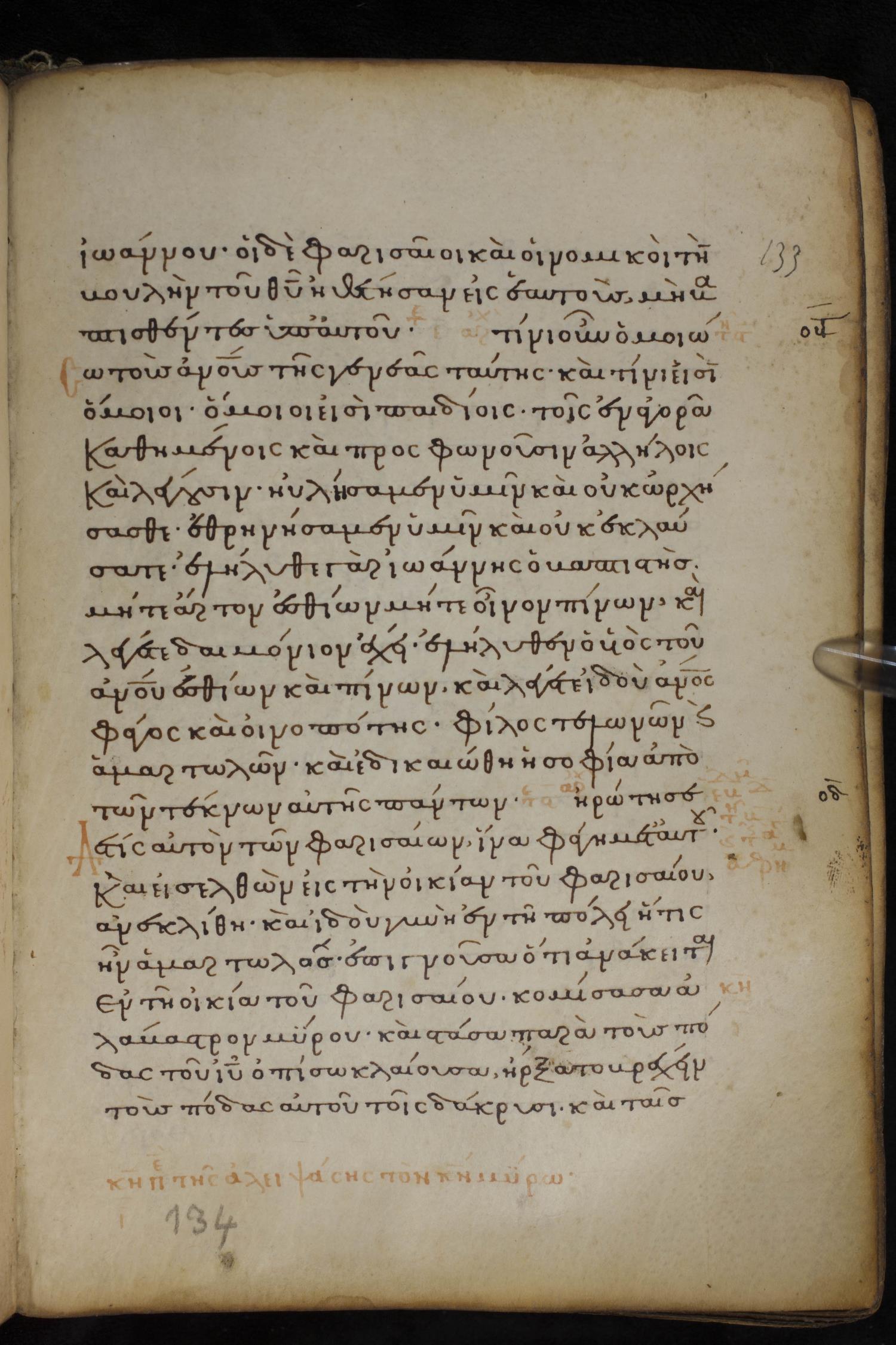 Thirteenth century minuscule of the Gospels on parchment; 237 leaves, 1 column, 23 lines per column. Images were taken at the National Library of Greece in Athens.