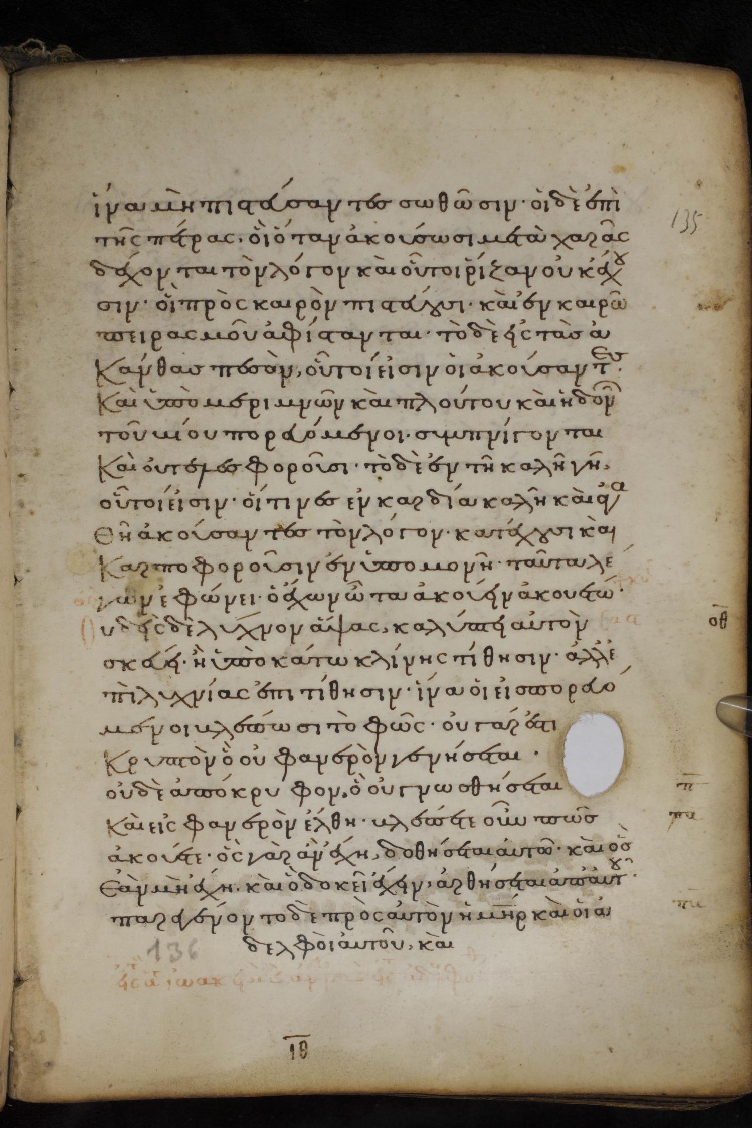 Thirteenth century minuscule of the Gospels on parchment; 237 leaves, 1 column, 23 lines per column. Images were taken at the National Library of Greece in Athens.