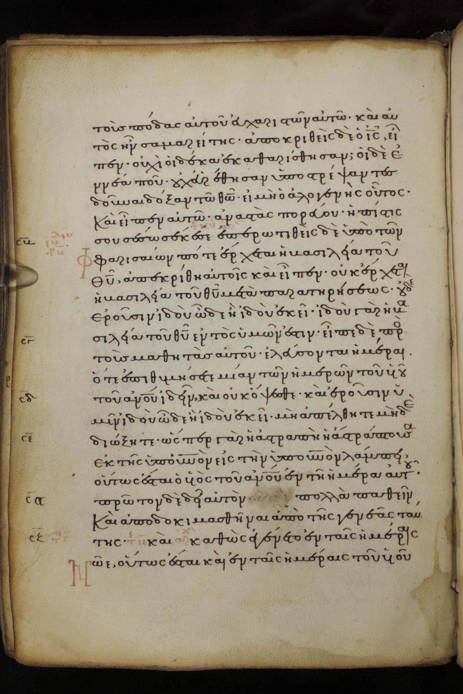 Thirteenth century minuscule of the Gospels on parchment; 237 leaves, 1 column, 23 lines per column. Images were taken at the National Library of Greece in Athens.