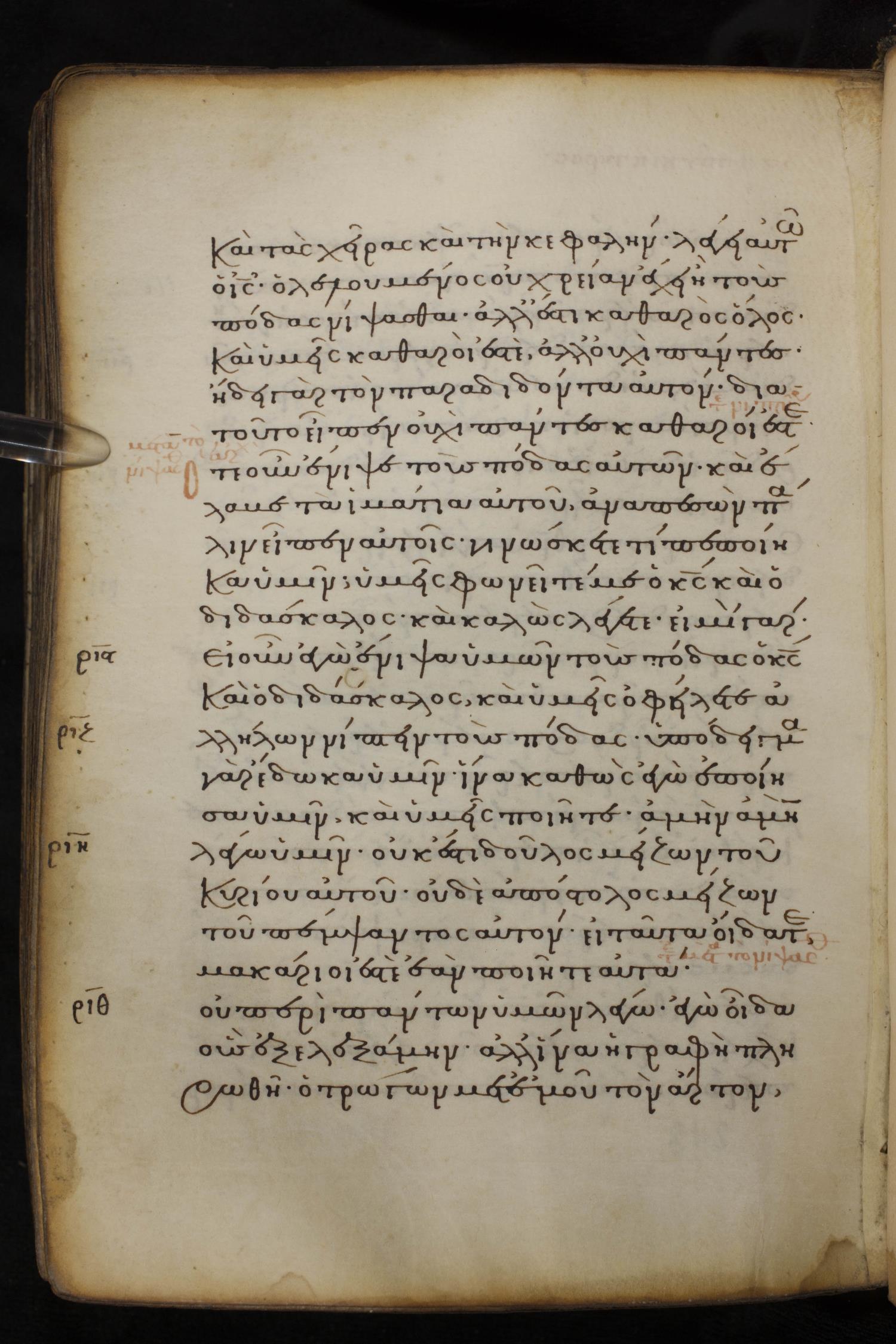Thirteenth century minuscule of the Gospels on parchment; 237 leaves, 1 column, 23 lines per column. Images were taken at the National Library of Greece in Athens.