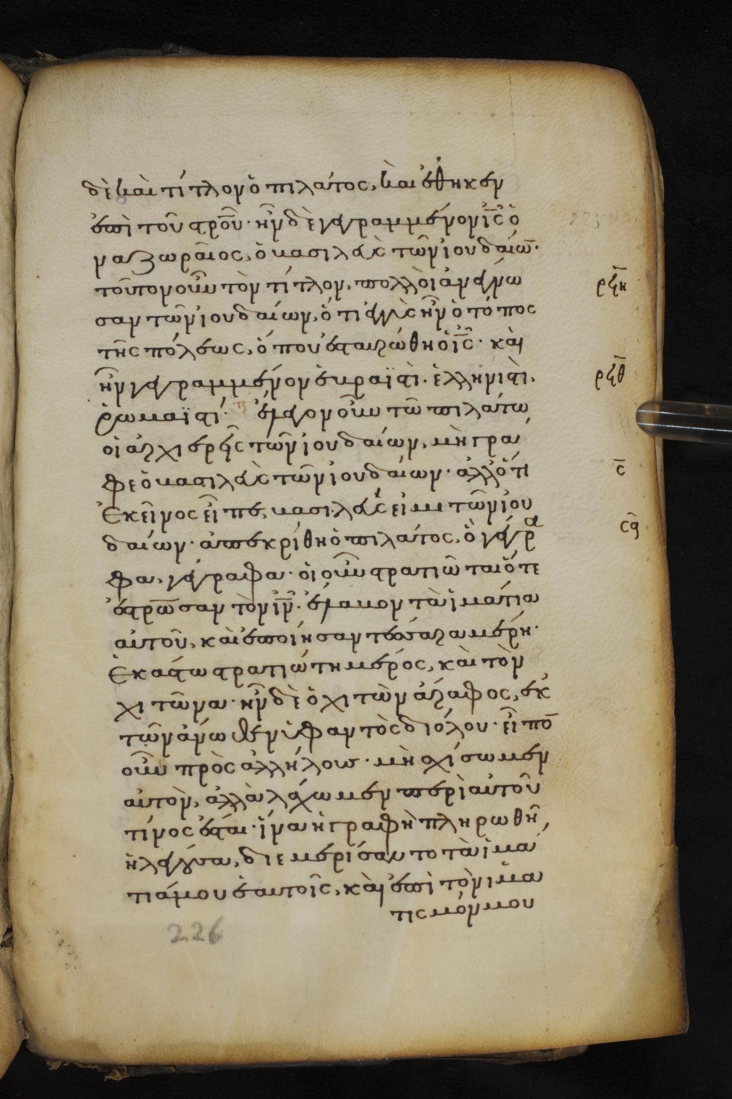 Thirteenth century minuscule of the Gospels on parchment; 237 leaves, 1 column, 23 lines per column. Images were taken at the National Library of Greece in Athens.