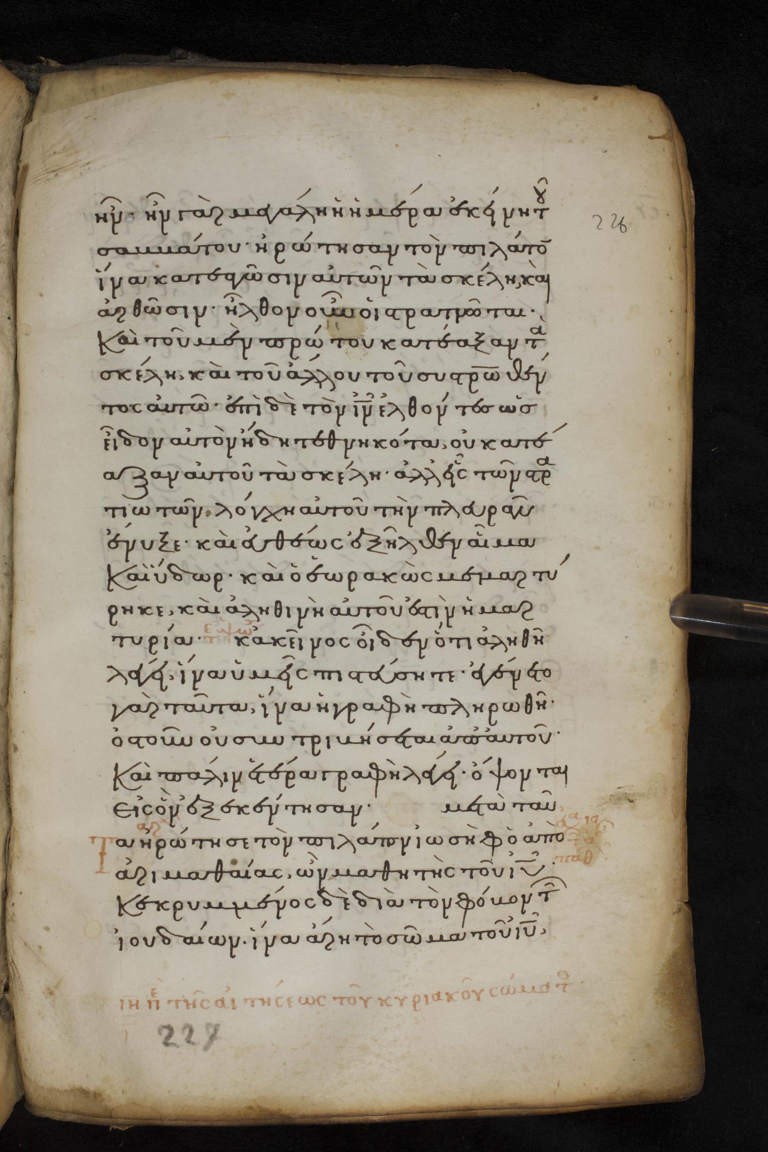 Thirteenth century minuscule of the Gospels on parchment; 237 leaves, 1 column, 23 lines per column. Images were taken at the National Library of Greece in Athens.