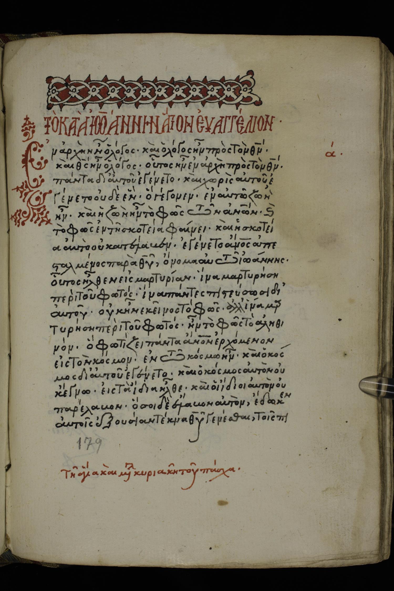 Seventeenth century minuscule dated to 1623 of the Gospels on paper; 231 leaves, 1 column, 22 lines per column. Images were taken at the National Library of Greece in Athens.