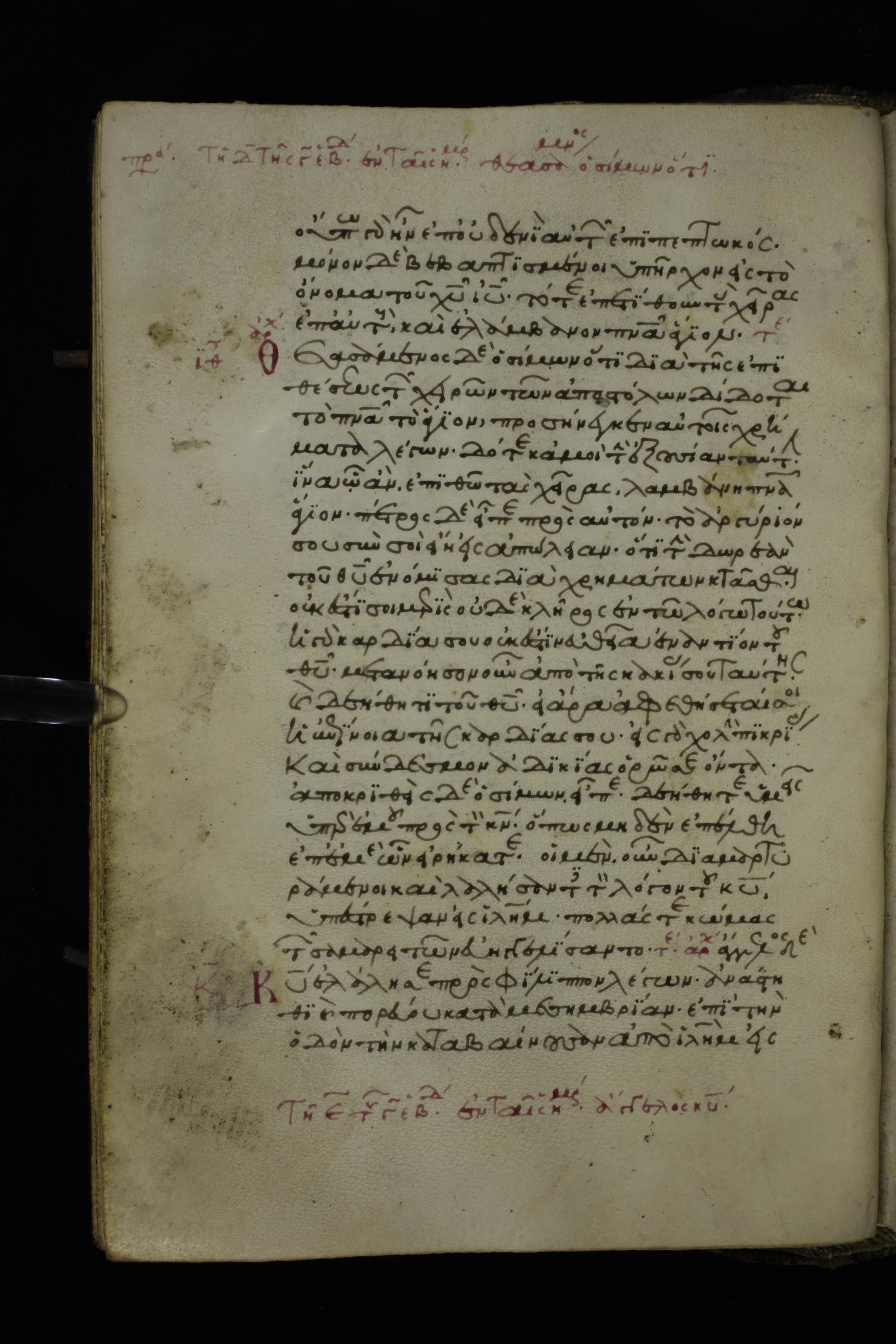 Fourteenth century minuscule of the Apostolos and Paul on parchment; 250 leaves, 1 column, 27 lines per column. Images were taken at the National Library of Greece in Athens.