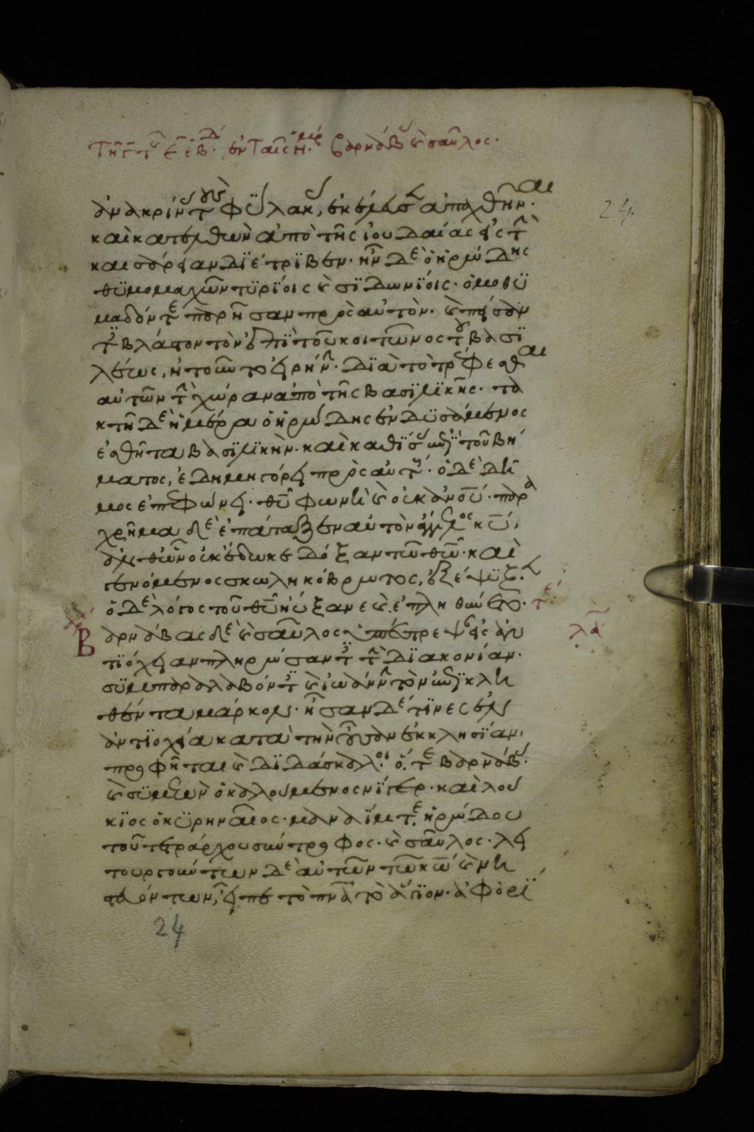 Fourteenth century minuscule of the Apostolos and Paul on parchment; 250 leaves, 1 column, 27 lines per column. Images were taken at the National Library of Greece in Athens.