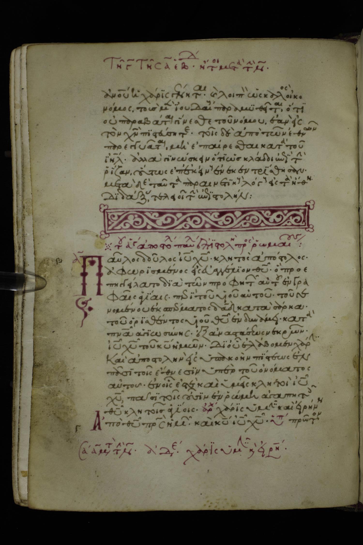 Fourteenth century minuscule of the Apostolos and Paul on parchment; 250 leaves, 1 column, 27 lines per column. Images were taken at the National Library of Greece in Athens.