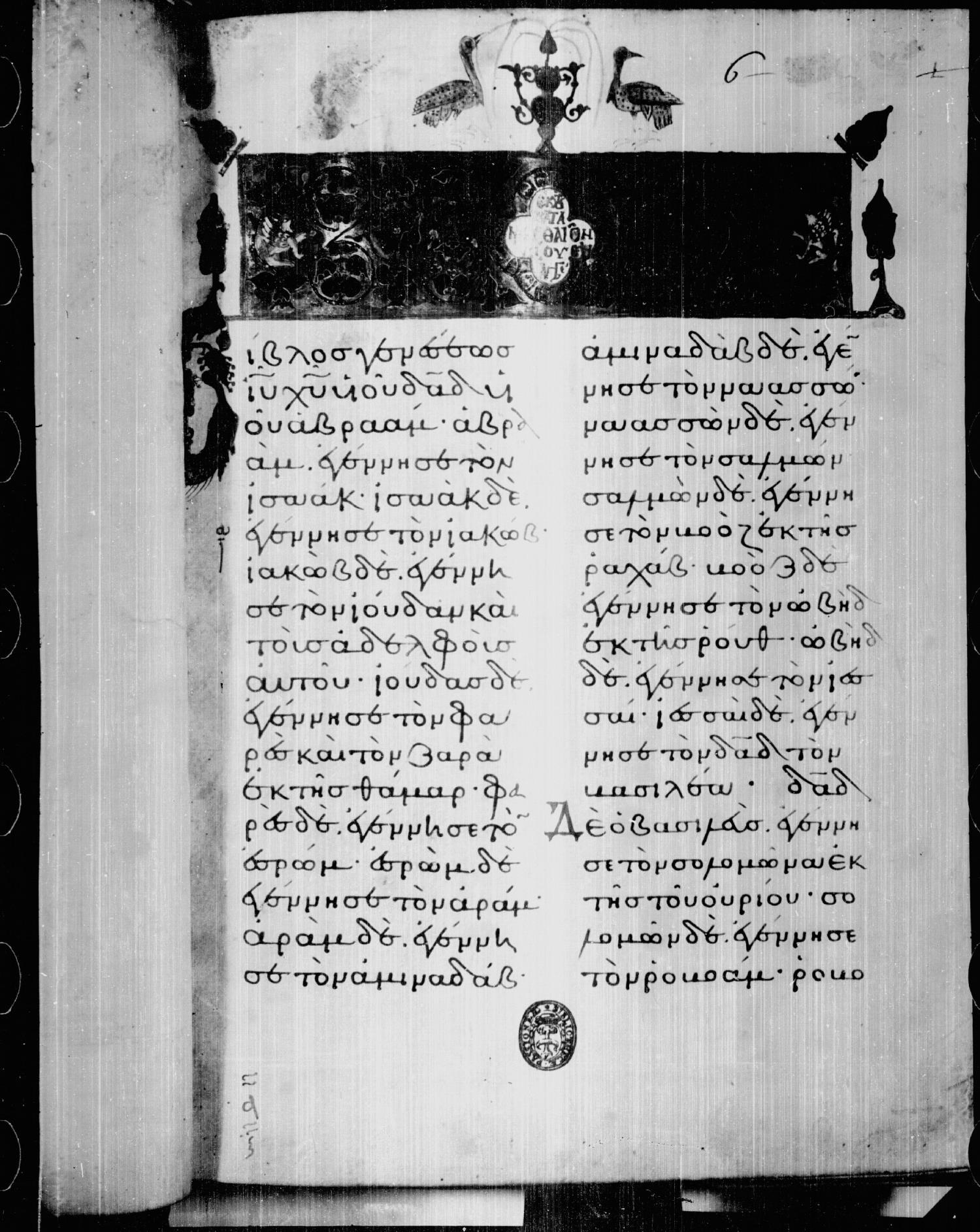 ΒΙΒΛΟΣ γενέσεως Ἰησοῦ Χριστοῦ υἱοῦ Δαυεὶδ / Δαυὶδ υἱοῦ Ἀβραάμ.