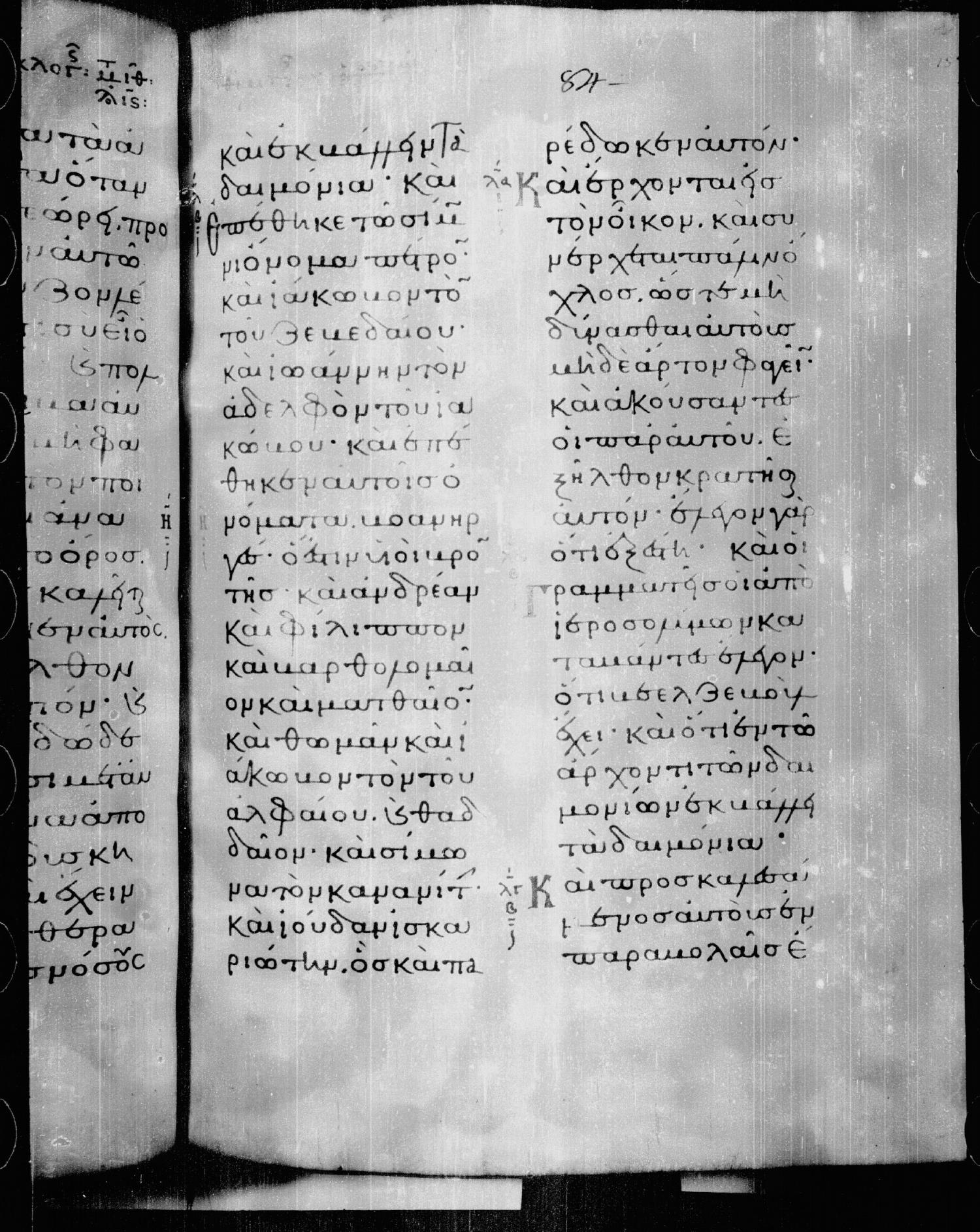 καὶ οἱ γραμματεῖς οἱ ἀπὸ Ἰεροσολύμων καταβάντες ἔλεγον ὅτι Βεεζεβοὺλ / Βεελζεβοὺλ ἔχει, καὶ ὅτι ἐν τῷ ἄρχοντι τῶν δαιμονίων ἐκβάλλει τὰ δαιμόνια.
