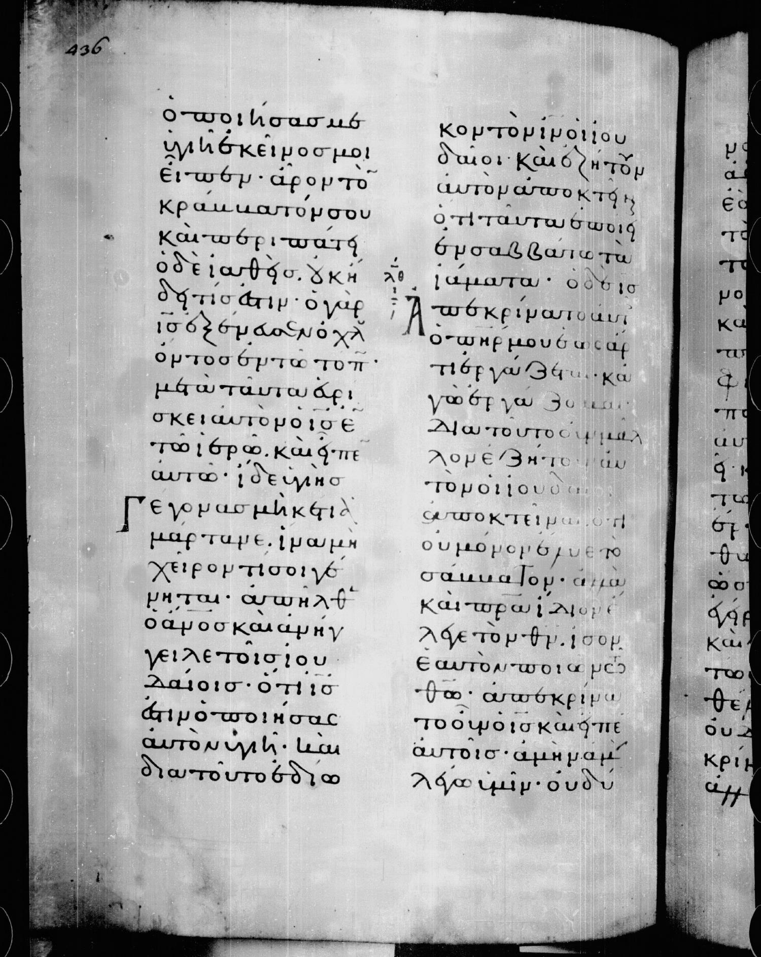 Twelfth century minuscule of the Gospels on parchment; 272 leaves, 2 columns, 23 lines per column.