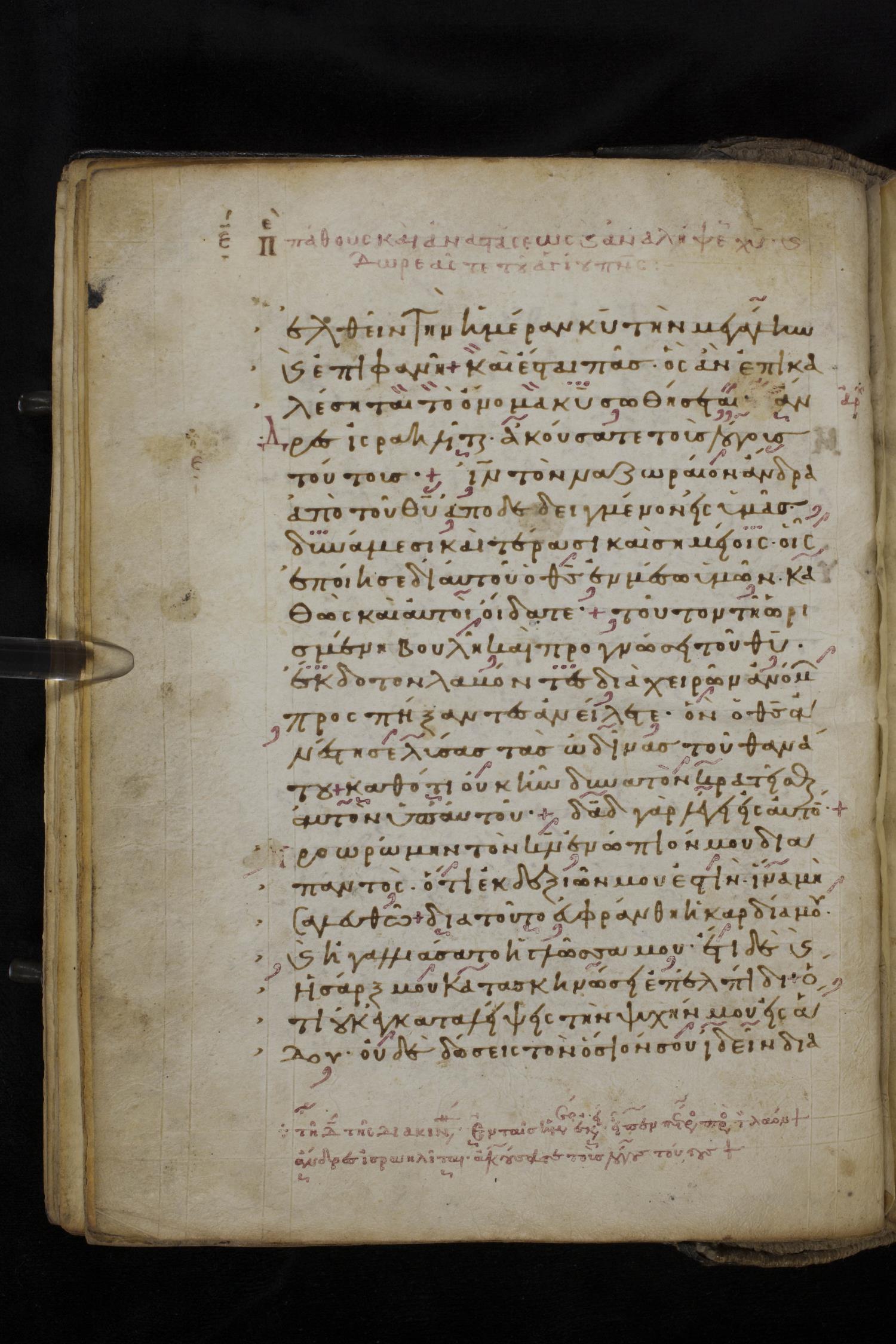 Eleventh century minuscule of the Apostolos, Paul, and Revelation on parchment; 327 leaves, 1 column, 22 lines per column. Images were taken at the National Library of Greece in Athens.