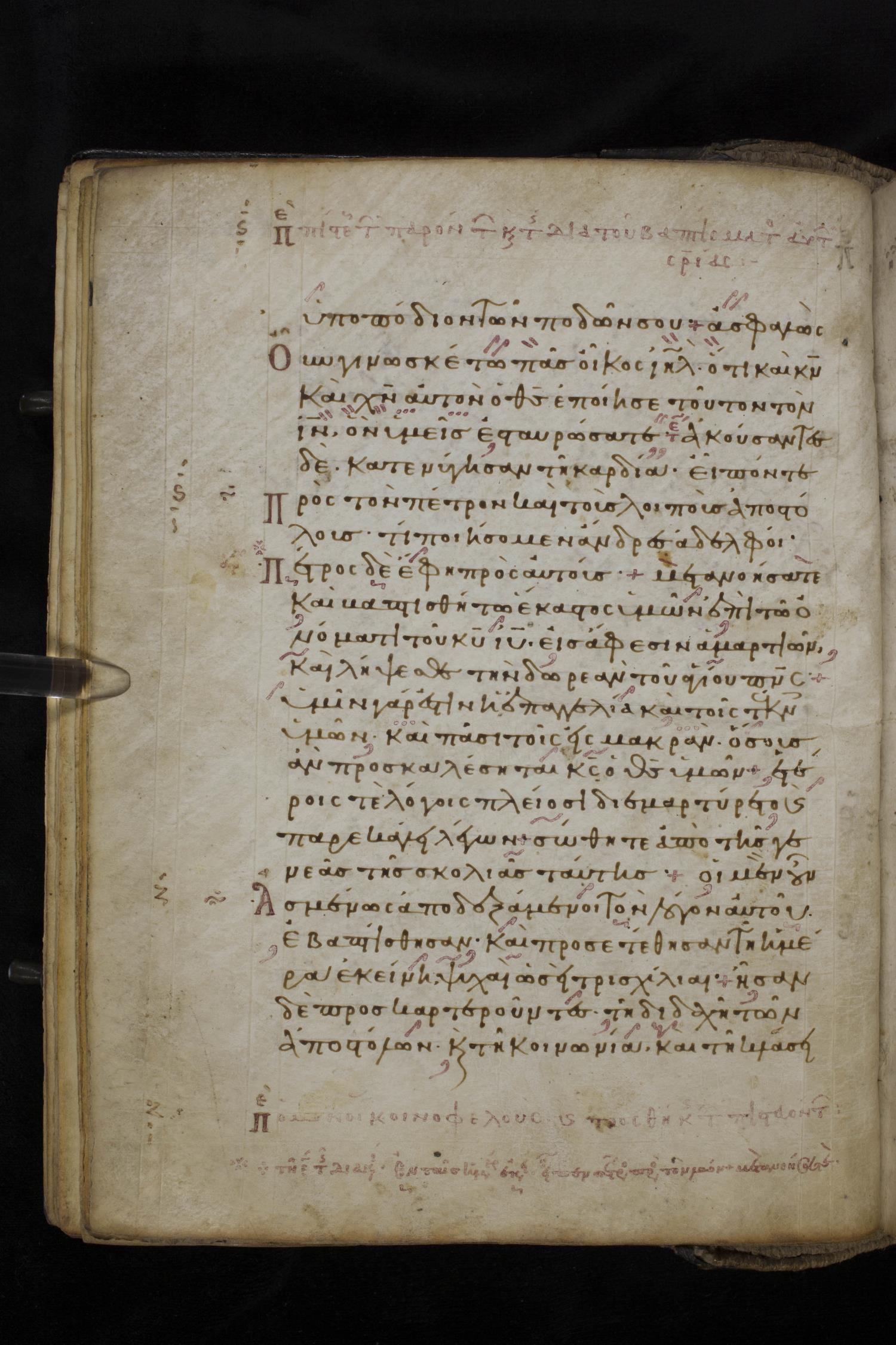 Eleventh century minuscule of the Apostolos, Paul, and Revelation on parchment; 327 leaves, 1 column, 22 lines per column. Images were taken at the National Library of Greece in Athens.