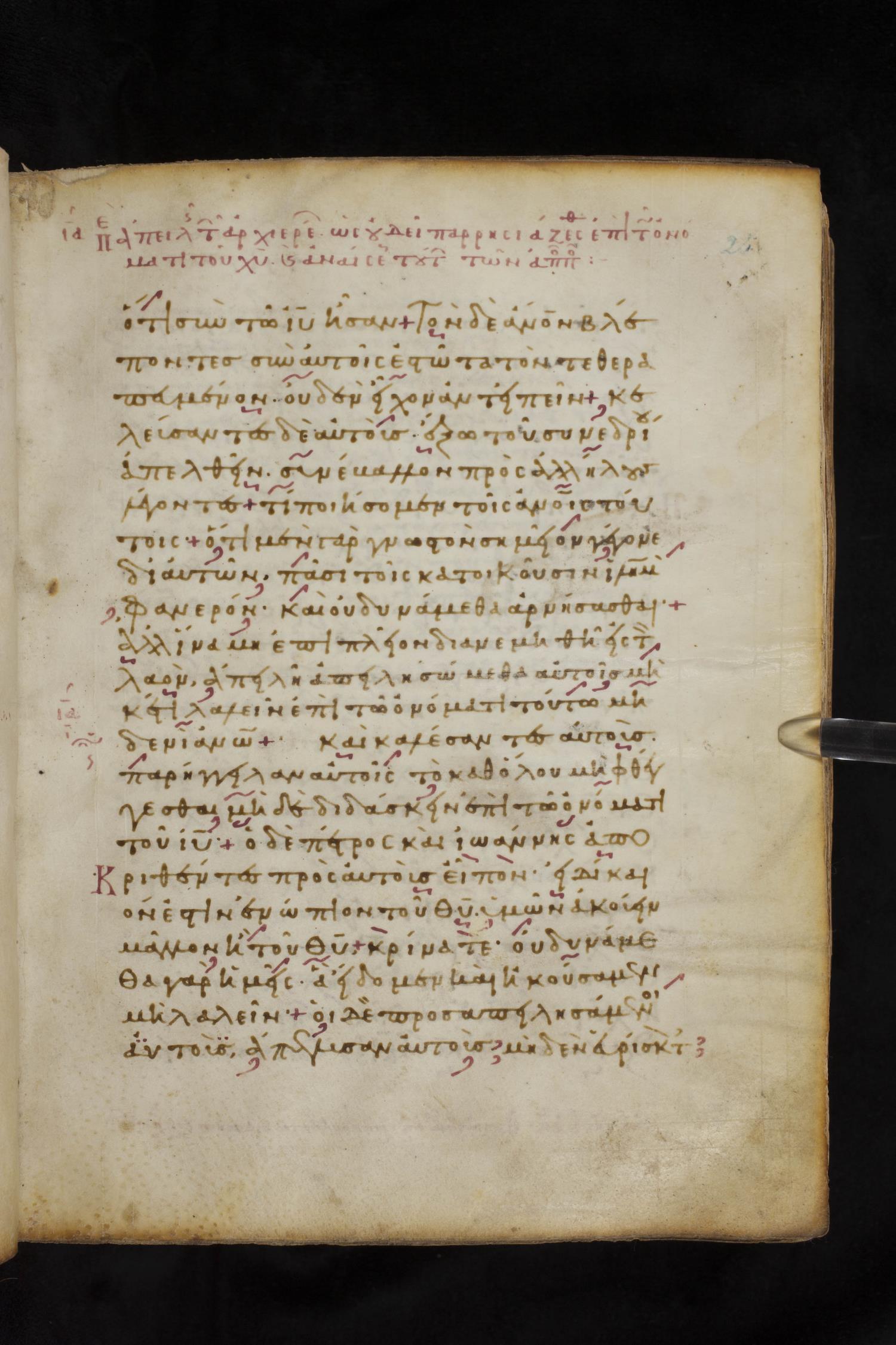 Eleventh century minuscule of the Apostolos, Paul, and Revelation on parchment; 327 leaves, 1 column, 22 lines per column. Images were taken at the National Library of Greece in Athens.