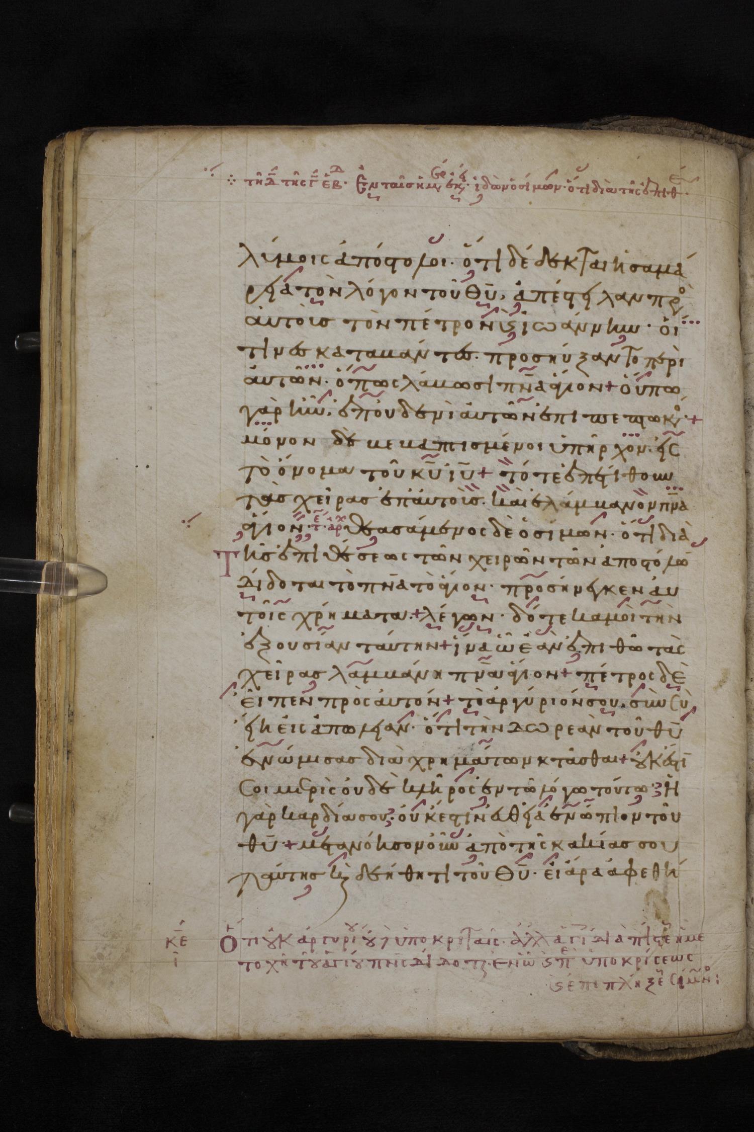 Eleventh century minuscule of the Apostolos, Paul, and Revelation on parchment; 327 leaves, 1 column, 22 lines per column. Images were taken at the National Library of Greece in Athens.
