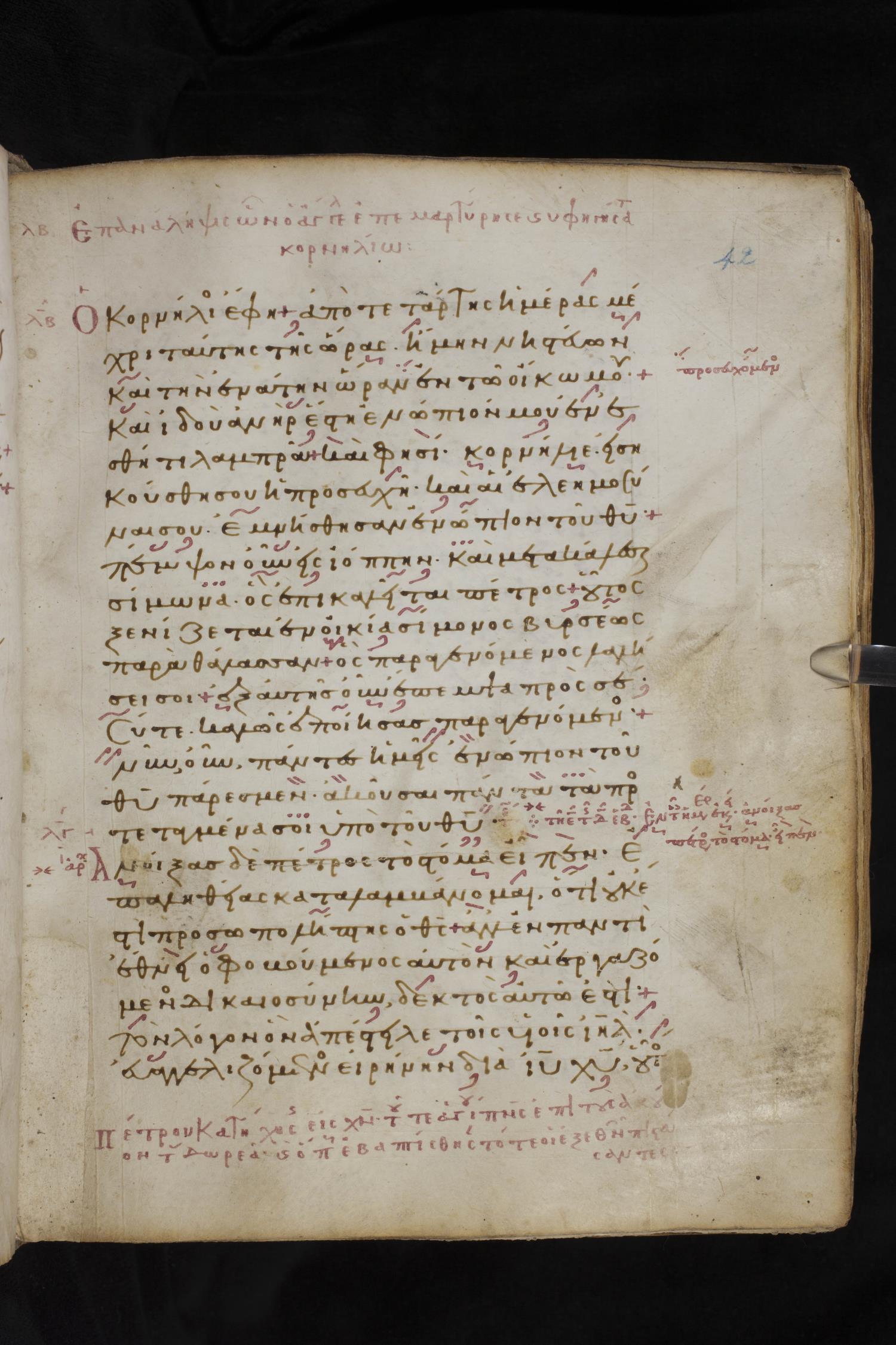Eleventh century minuscule of the Apostolos, Paul, and Revelation on parchment; 327 leaves, 1 column, 22 lines per column. Images were taken at the National Library of Greece in Athens.
