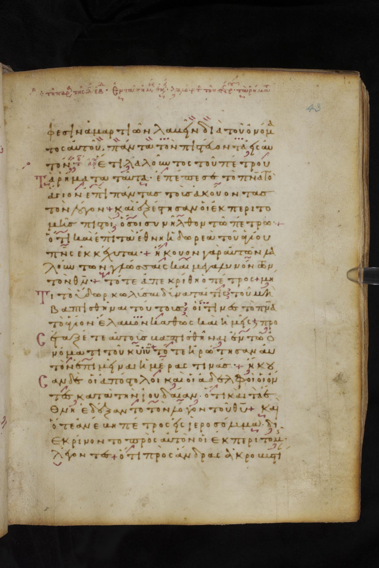Eleventh century minuscule of the Apostolos, Paul, and Revelation on parchment; 327 leaves, 1 column, 22 lines per column. Images were taken at the National Library of Greece in Athens.