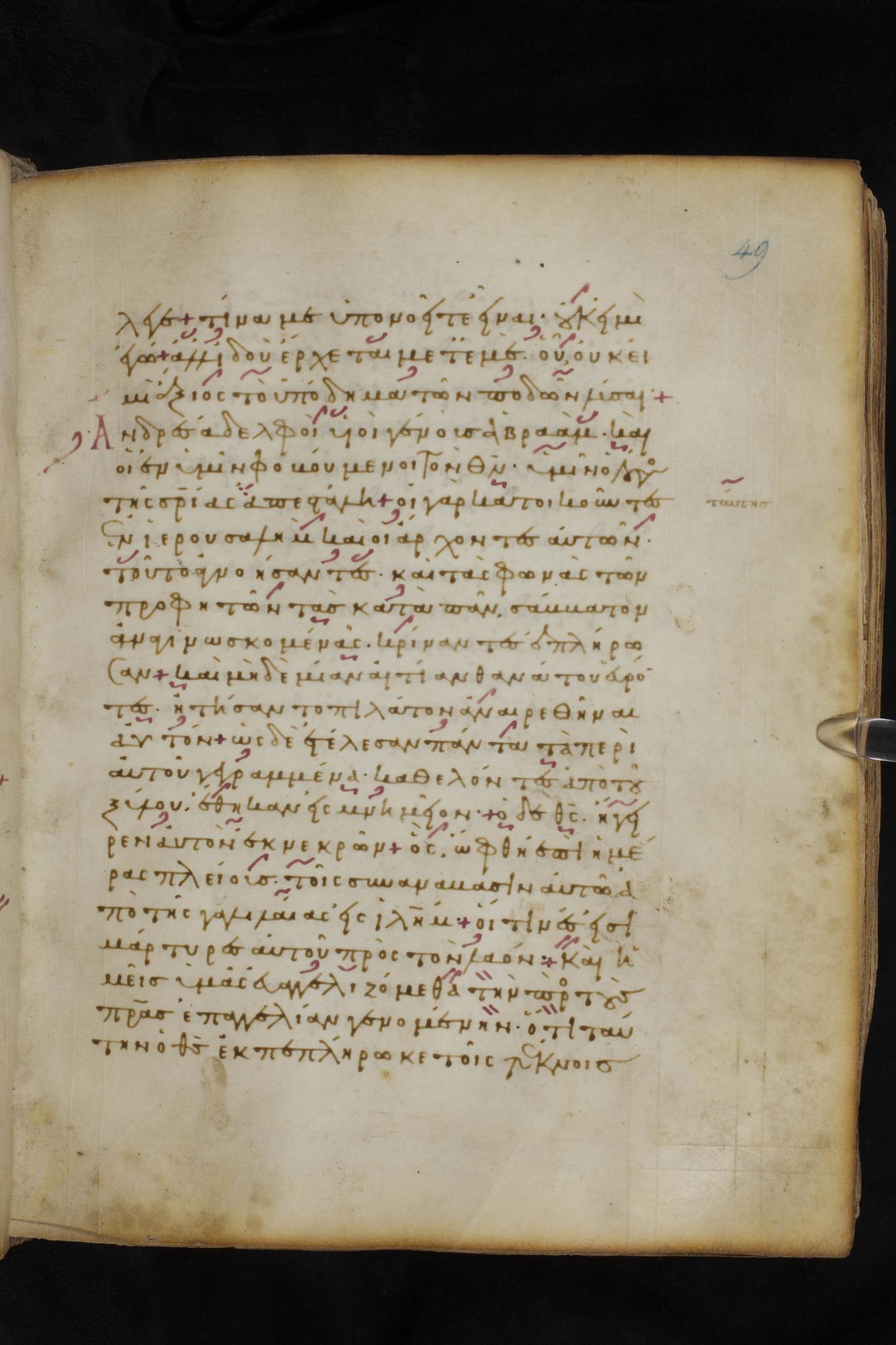 Eleventh century minuscule of the Apostolos, Paul, and Revelation on parchment; 327 leaves, 1 column, 22 lines per column. Images were taken at the National Library of Greece in Athens.