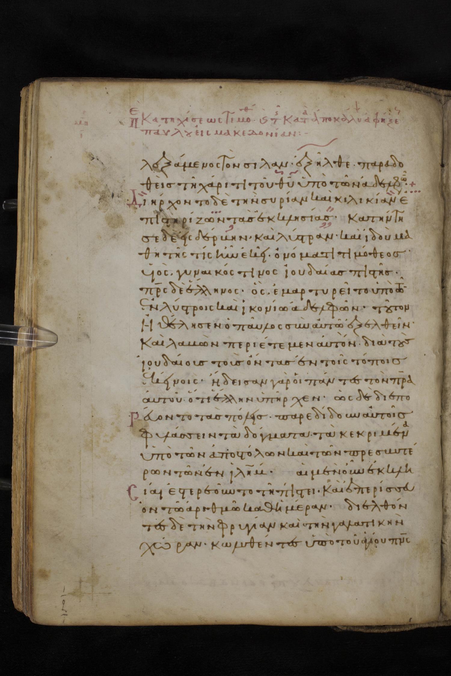 Eleventh century minuscule of the Apostolos, Paul, and Revelation on parchment; 327 leaves, 1 column, 22 lines per column. Images were taken at the National Library of Greece in Athens.