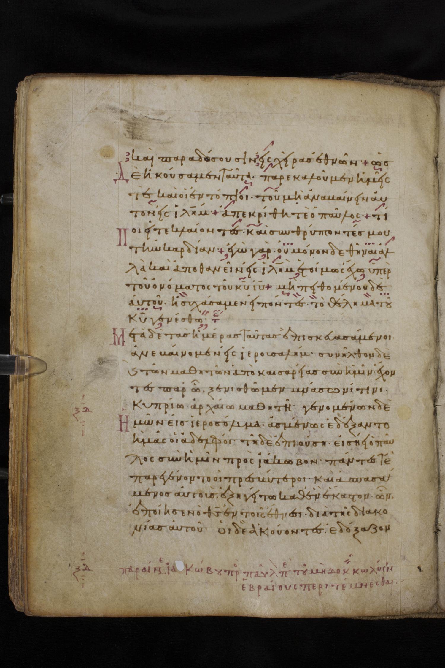 Eleventh century minuscule of the Apostolos, Paul, and Revelation on parchment; 327 leaves, 1 column, 22 lines per column. Images were taken at the National Library of Greece in Athens.