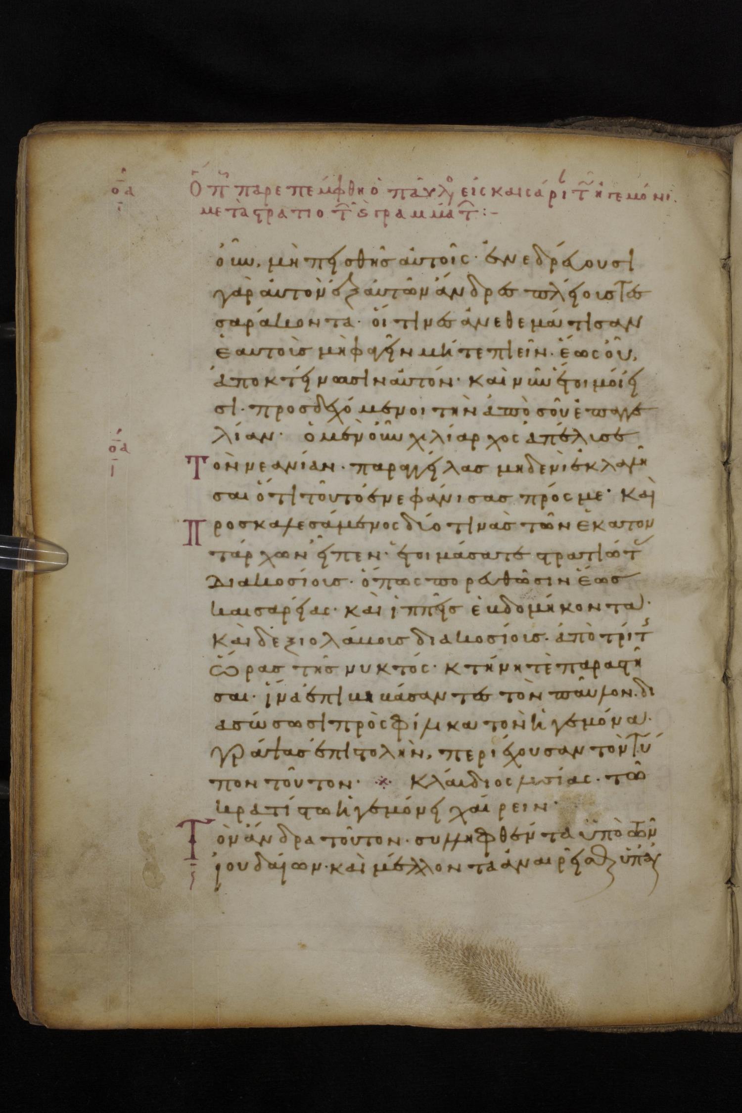 Eleventh century minuscule of the Apostolos, Paul, and Revelation on parchment; 327 leaves, 1 column, 22 lines per column. Images were taken at the National Library of Greece in Athens.