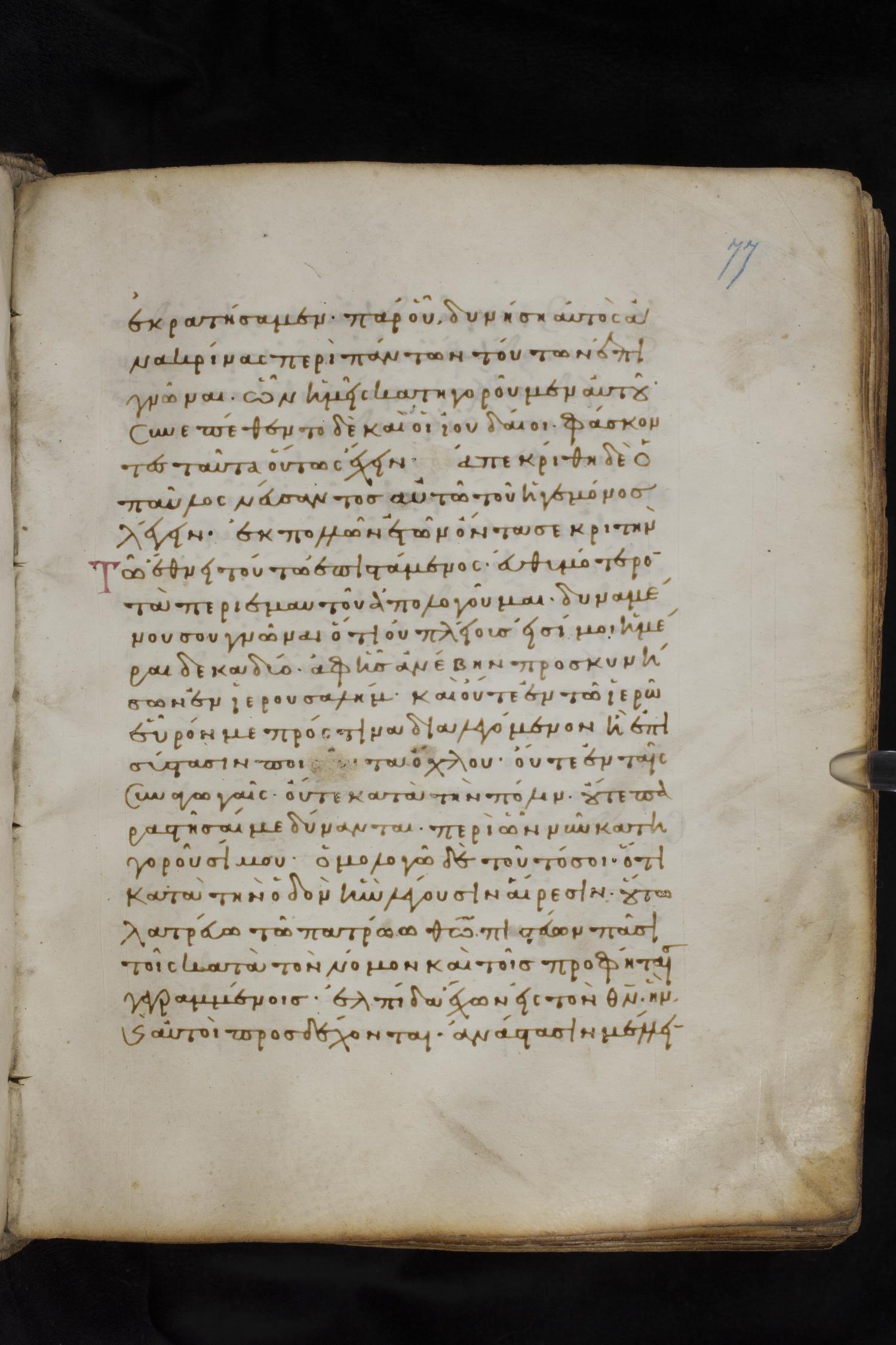 Eleventh century minuscule of the Apostolos, Paul, and Revelation on parchment; 327 leaves, 1 column, 22 lines per column. Images were taken at the National Library of Greece in Athens.