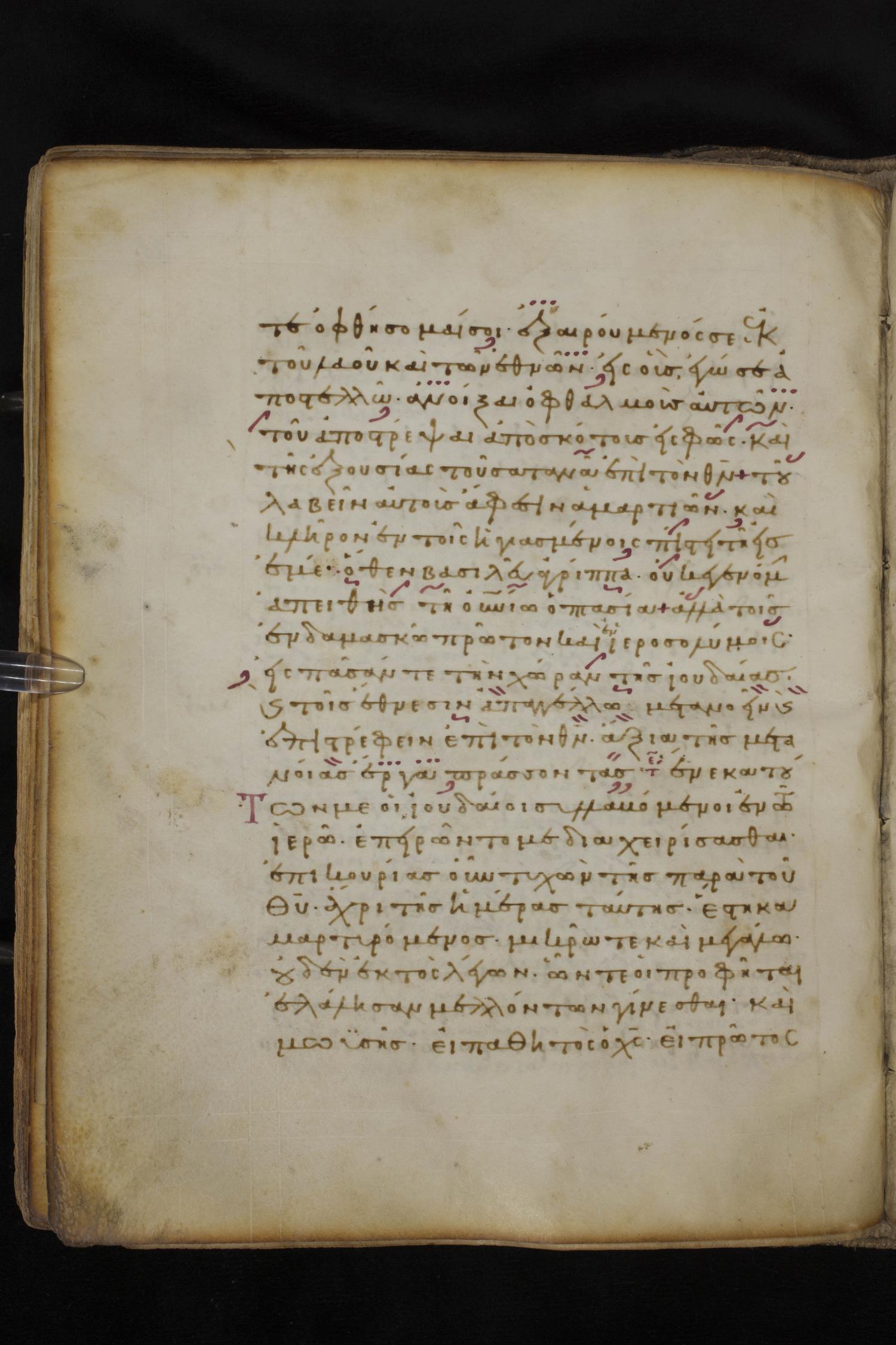 Eleventh century minuscule of the Apostolos, Paul, and Revelation on parchment; 327 leaves, 1 column, 22 lines per column. Images were taken at the National Library of Greece in Athens.