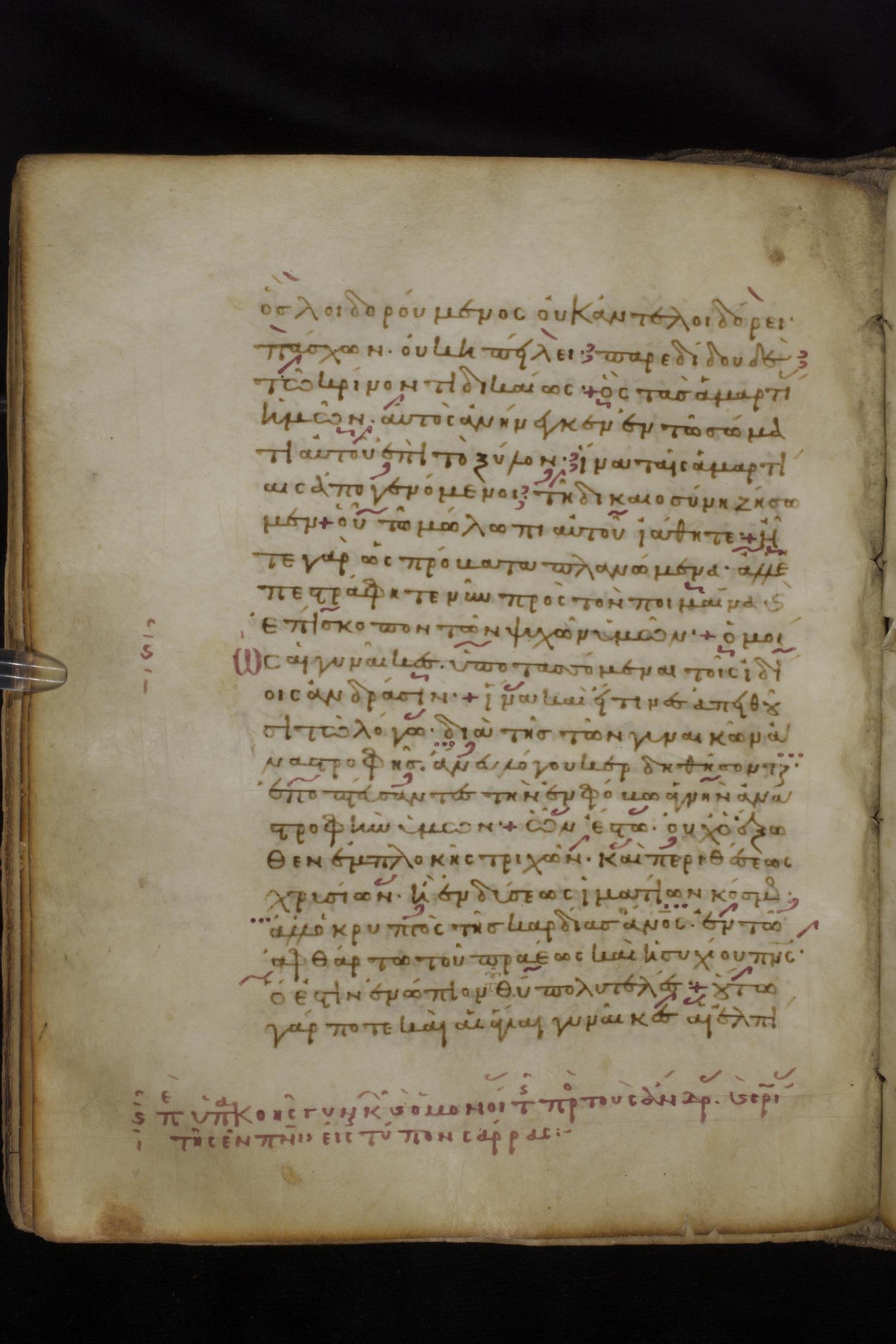 Eleventh century minuscule of the Apostolos, Paul, and Revelation on parchment; 327 leaves, 1 column, 22 lines per column. Images were taken at the National Library of Greece in Athens.