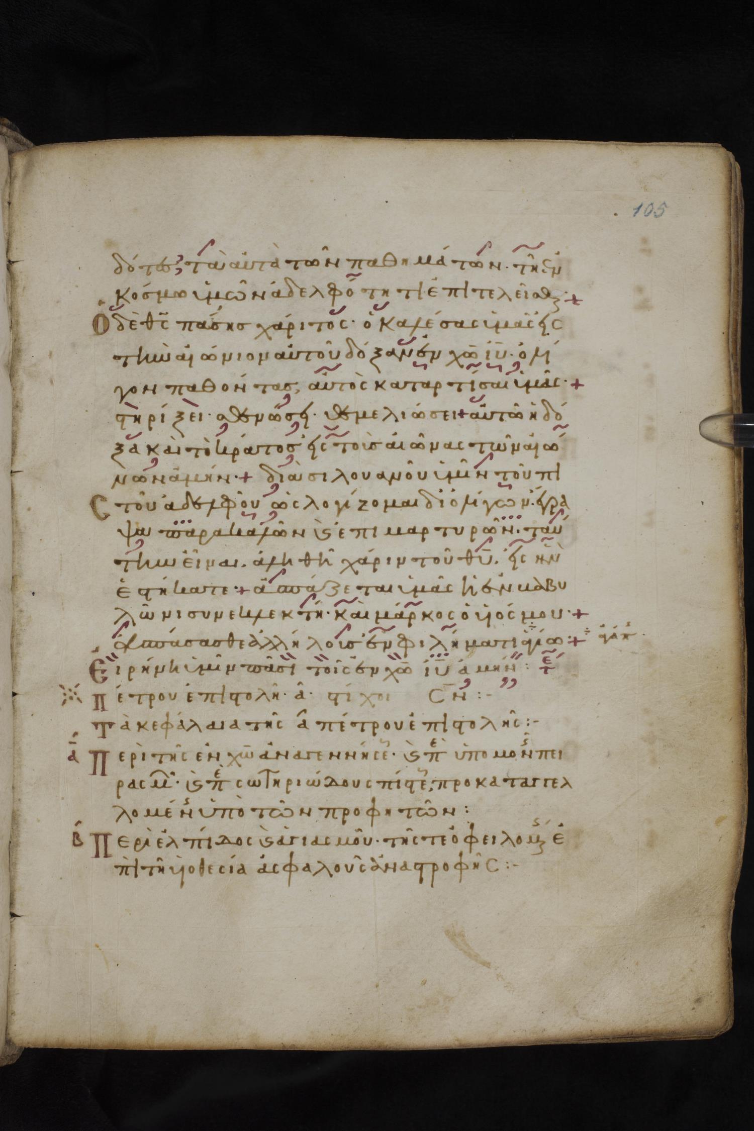Eleventh century minuscule of the Apostolos, Paul, and Revelation on parchment; 327 leaves, 1 column, 22 lines per column. Images were taken at the National Library of Greece in Athens.