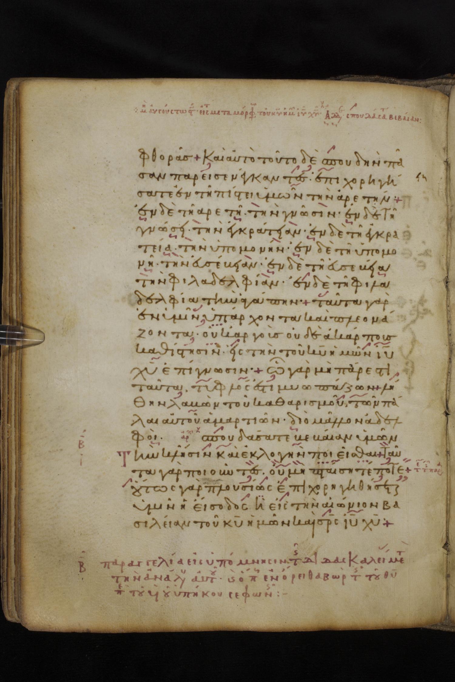 Eleventh century minuscule of the Apostolos, Paul, and Revelation on parchment; 327 leaves, 1 column, 22 lines per column. Images were taken at the National Library of Greece in Athens.
