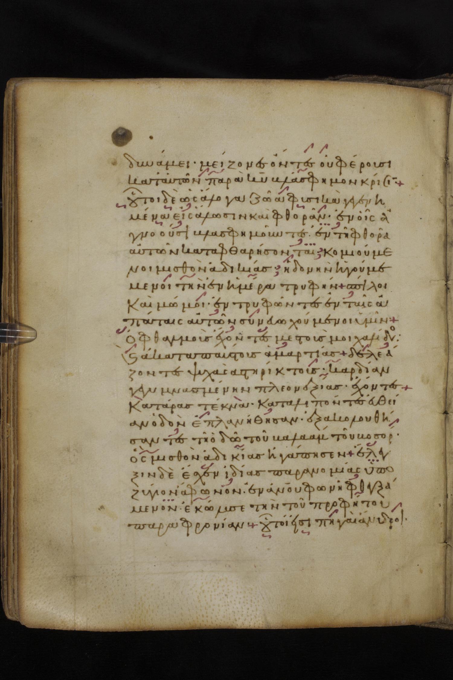 Eleventh century minuscule of the Apostolos, Paul, and Revelation on parchment; 327 leaves, 1 column, 22 lines per column. Images were taken at the National Library of Greece in Athens.