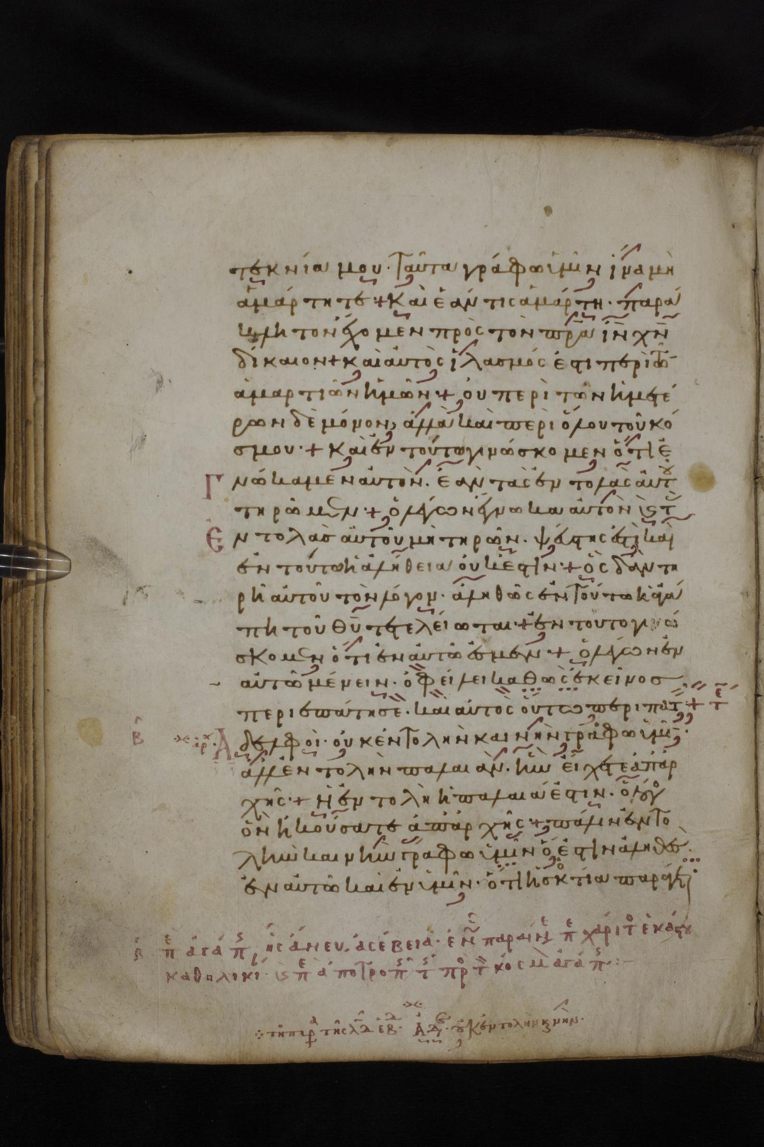 Eleventh century minuscule of the Apostolos, Paul, and Revelation on parchment; 327 leaves, 1 column, 22 lines per column. Images were taken at the National Library of Greece in Athens.
