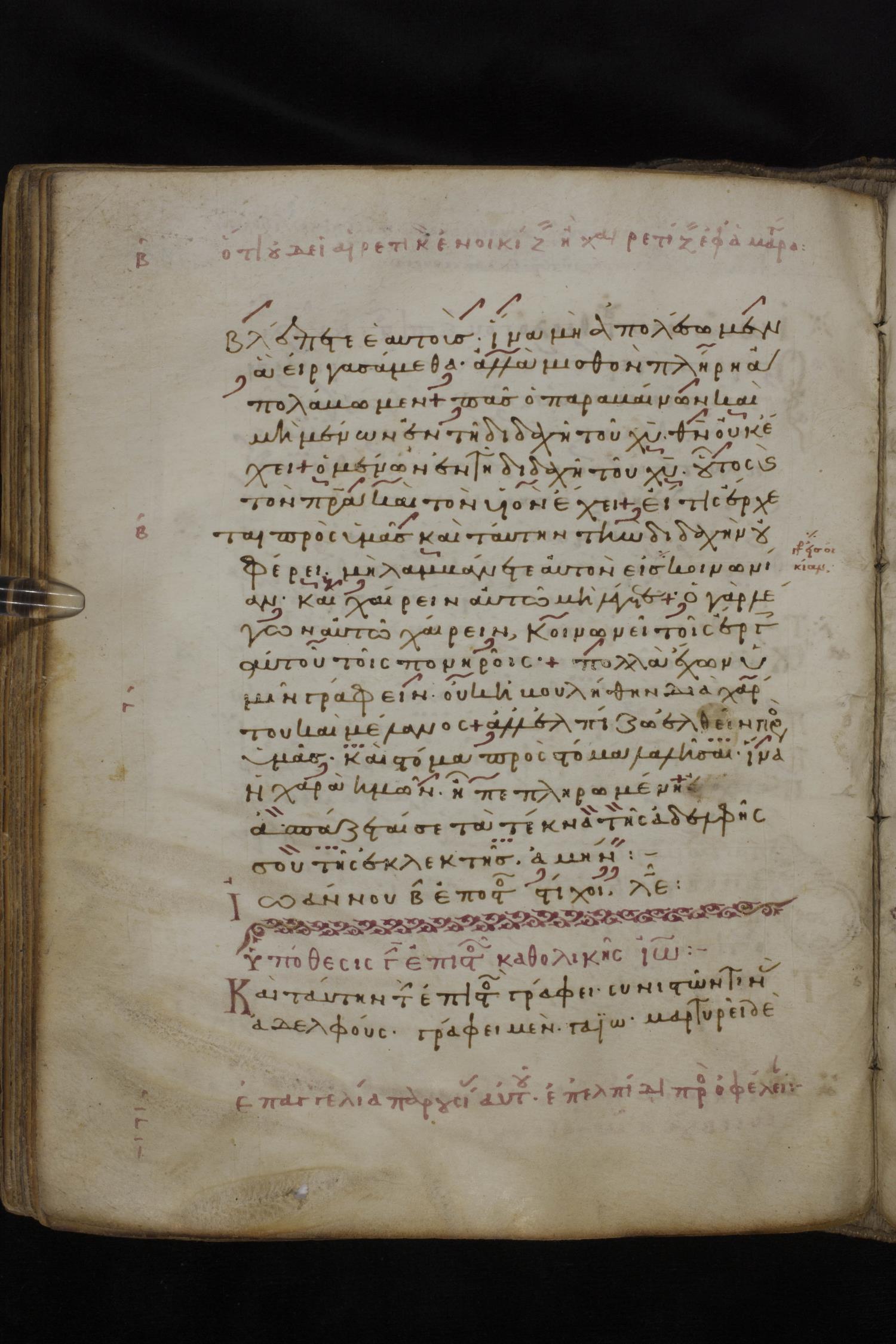 Eleventh century minuscule of the Apostolos, Paul, and Revelation on parchment; 327 leaves, 1 column, 22 lines per column. Images were taken at the National Library of Greece in Athens.