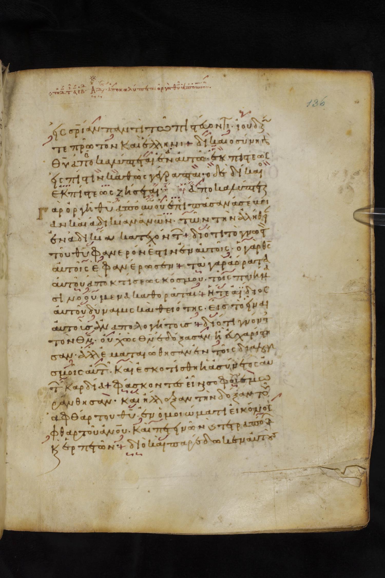 Eleventh century minuscule of the Apostolos, Paul, and Revelation on parchment; 327 leaves, 1 column, 22 lines per column. Images were taken at the National Library of Greece in Athens.