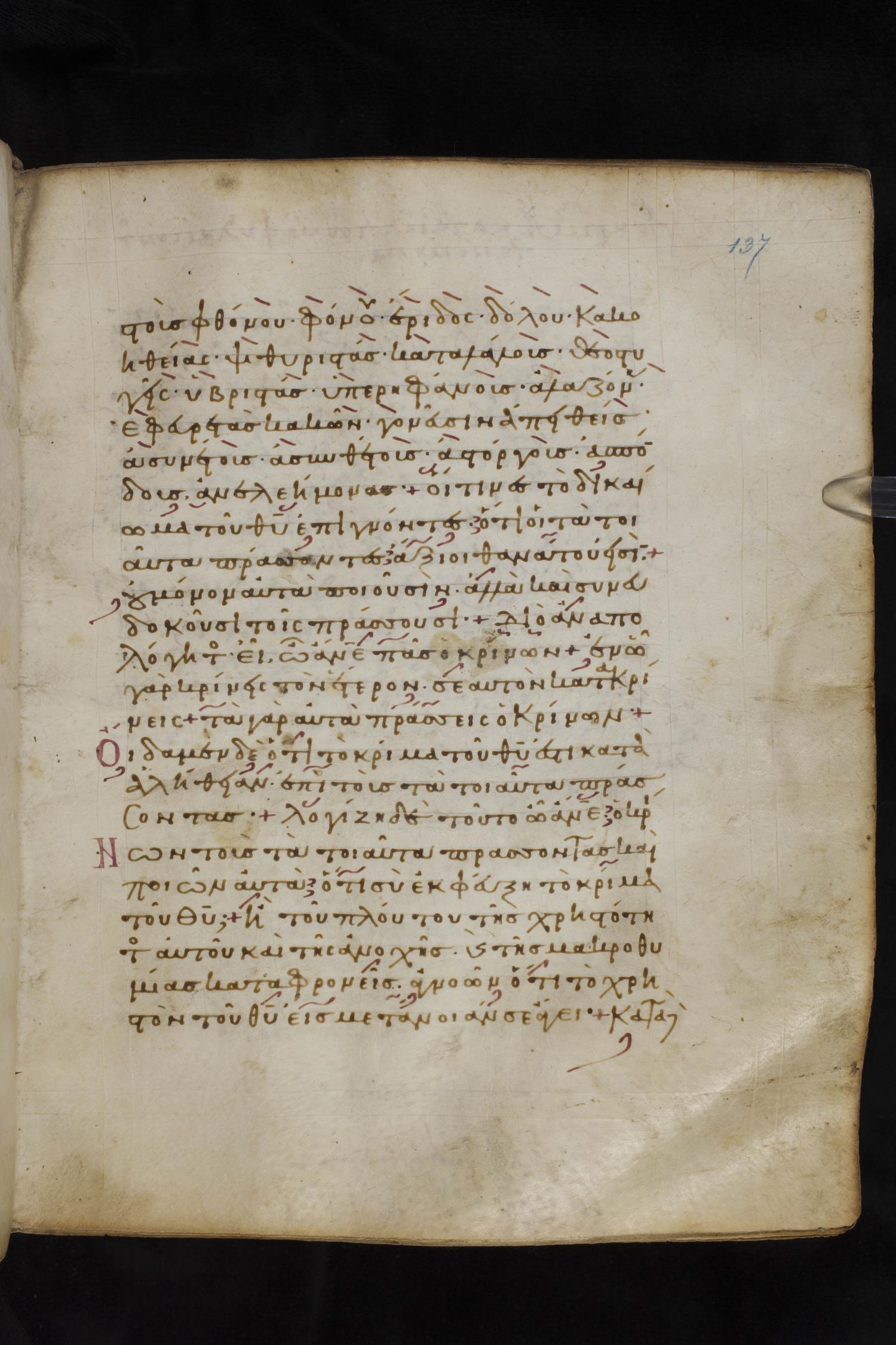 Eleventh century minuscule of the Apostolos, Paul, and Revelation on parchment; 327 leaves, 1 column, 22 lines per column. Images were taken at the National Library of Greece in Athens.