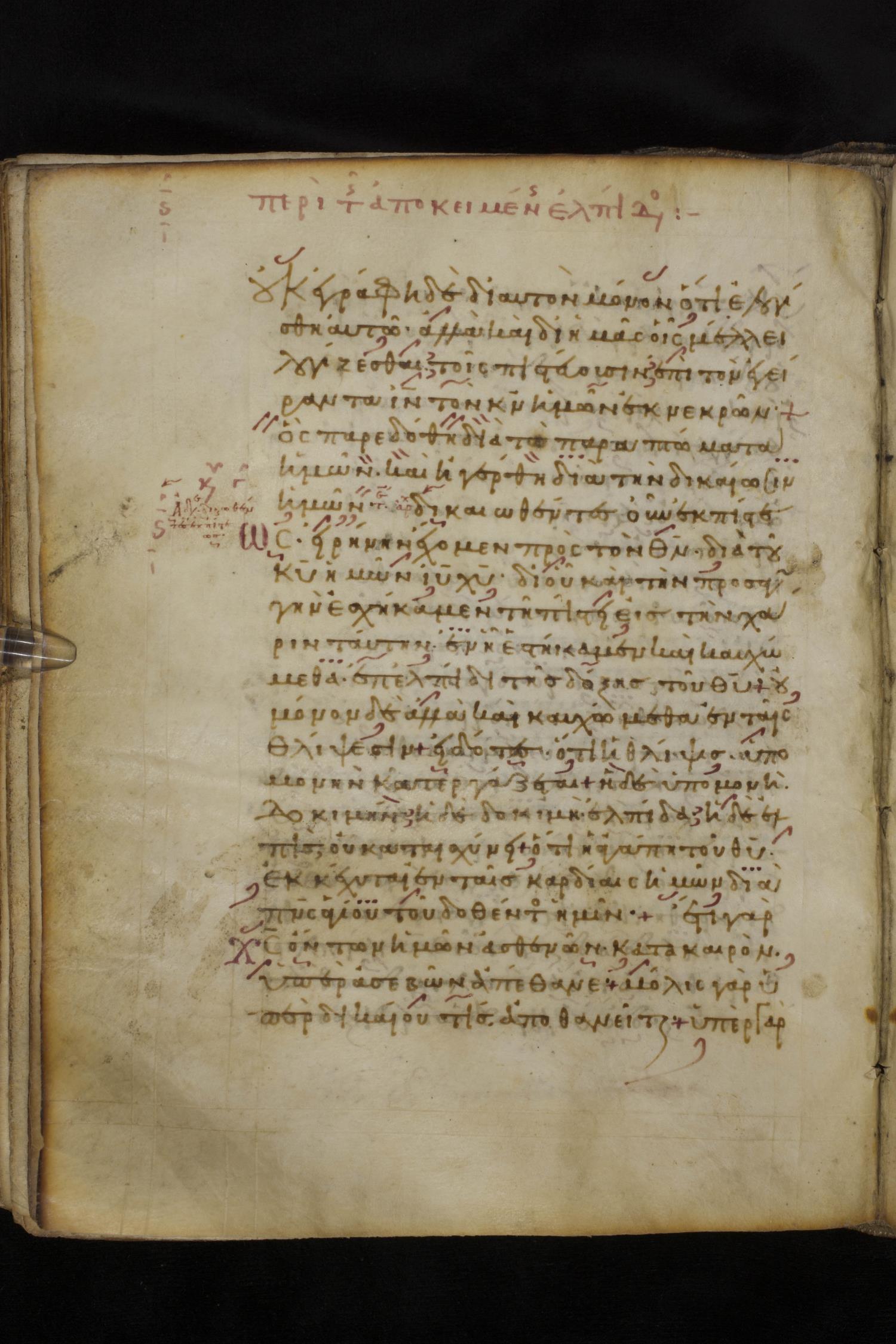 Eleventh century minuscule of the Apostolos, Paul, and Revelation on parchment; 327 leaves, 1 column, 22 lines per column. Images were taken at the National Library of Greece in Athens.