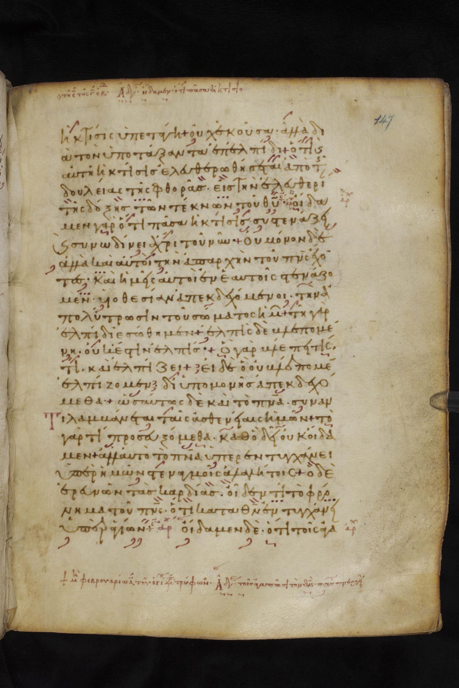 Eleventh century minuscule of the Apostolos, Paul, and Revelation on parchment; 327 leaves, 1 column, 22 lines per column. Images were taken at the National Library of Greece in Athens.