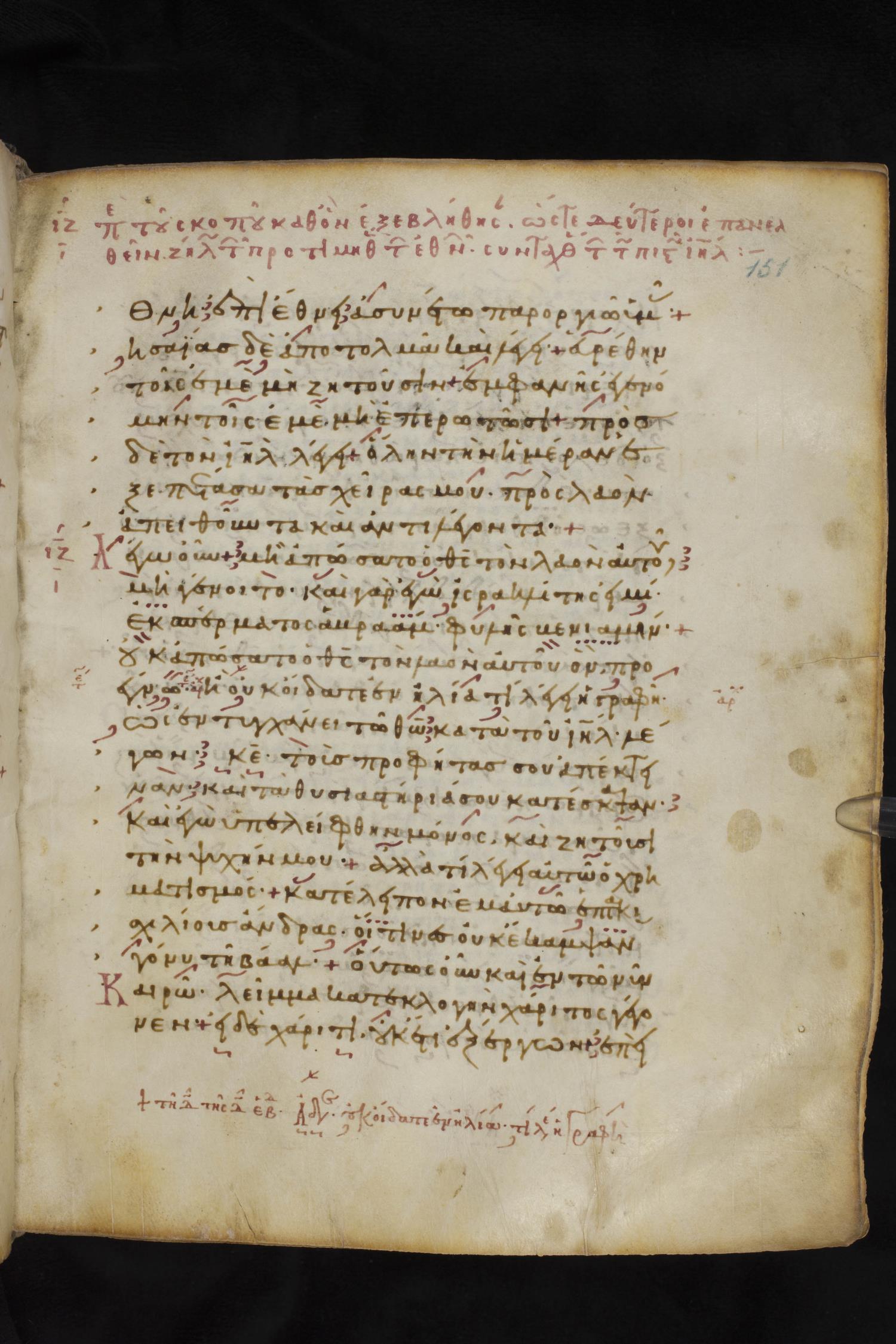 Eleventh century minuscule of the Apostolos, Paul, and Revelation on parchment; 327 leaves, 1 column, 22 lines per column. Images were taken at the National Library of Greece in Athens.