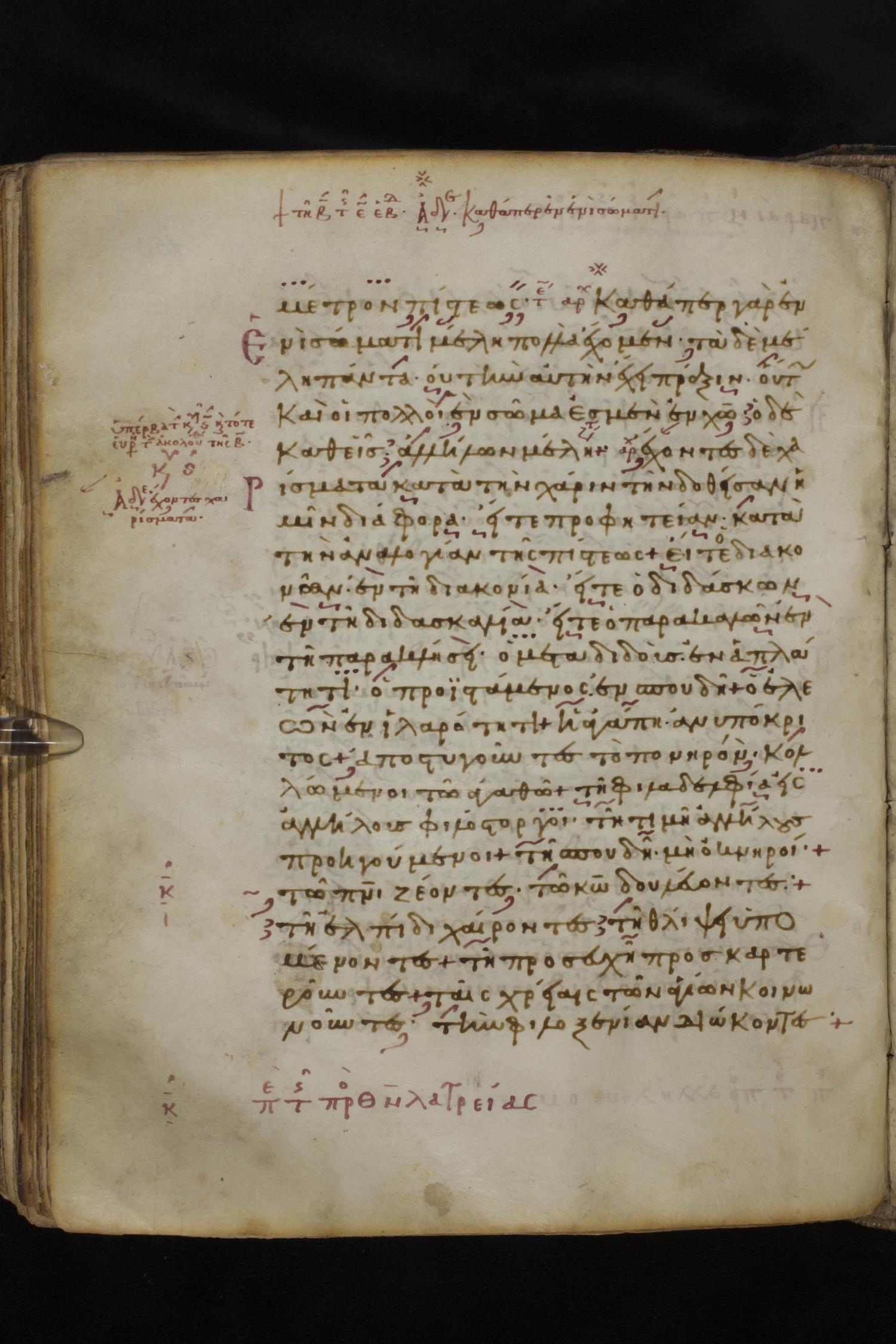 Eleventh century minuscule of the Apostolos, Paul, and Revelation on parchment; 327 leaves, 1 column, 22 lines per column. Images were taken at the National Library of Greece in Athens.