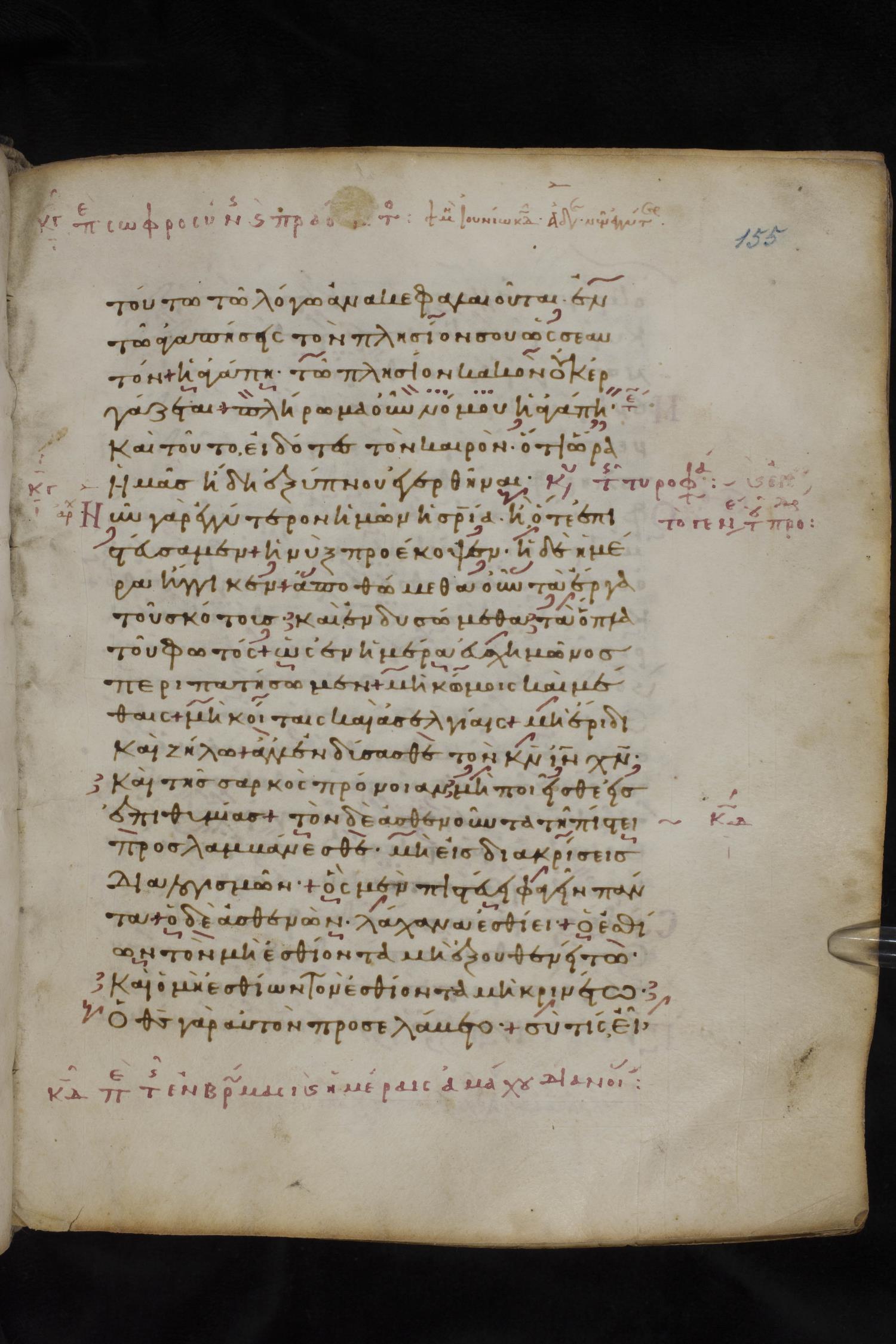 Eleventh century minuscule of the Apostolos, Paul, and Revelation on parchment; 327 leaves, 1 column, 22 lines per column. Images were taken at the National Library of Greece in Athens.