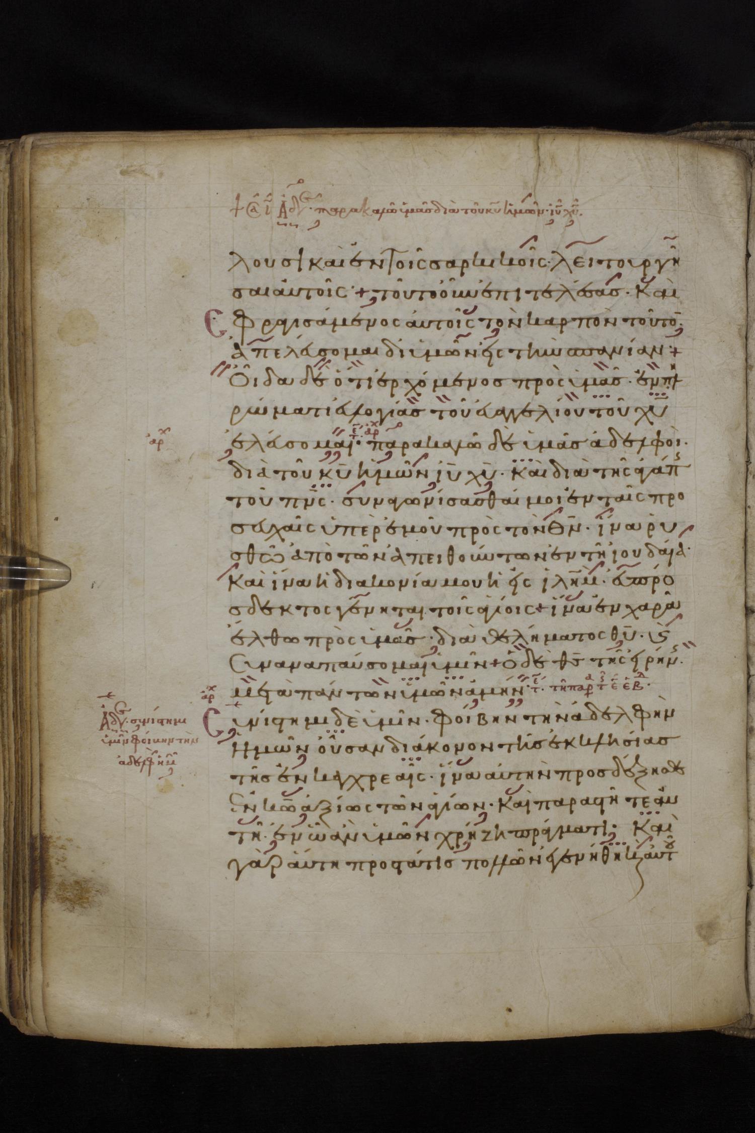 Eleventh century minuscule of the Apostolos, Paul, and Revelation on parchment; 327 leaves, 1 column, 22 lines per column. Images were taken at the National Library of Greece in Athens.