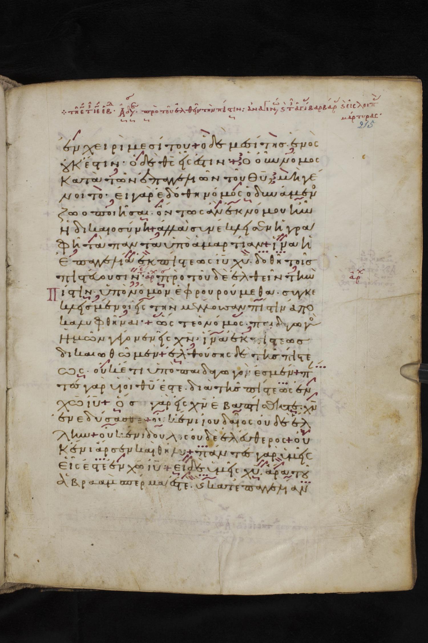 Eleventh century minuscule of the Apostolos, Paul, and Revelation on parchment; 327 leaves, 1 column, 22 lines per column. Images were taken at the National Library of Greece in Athens.