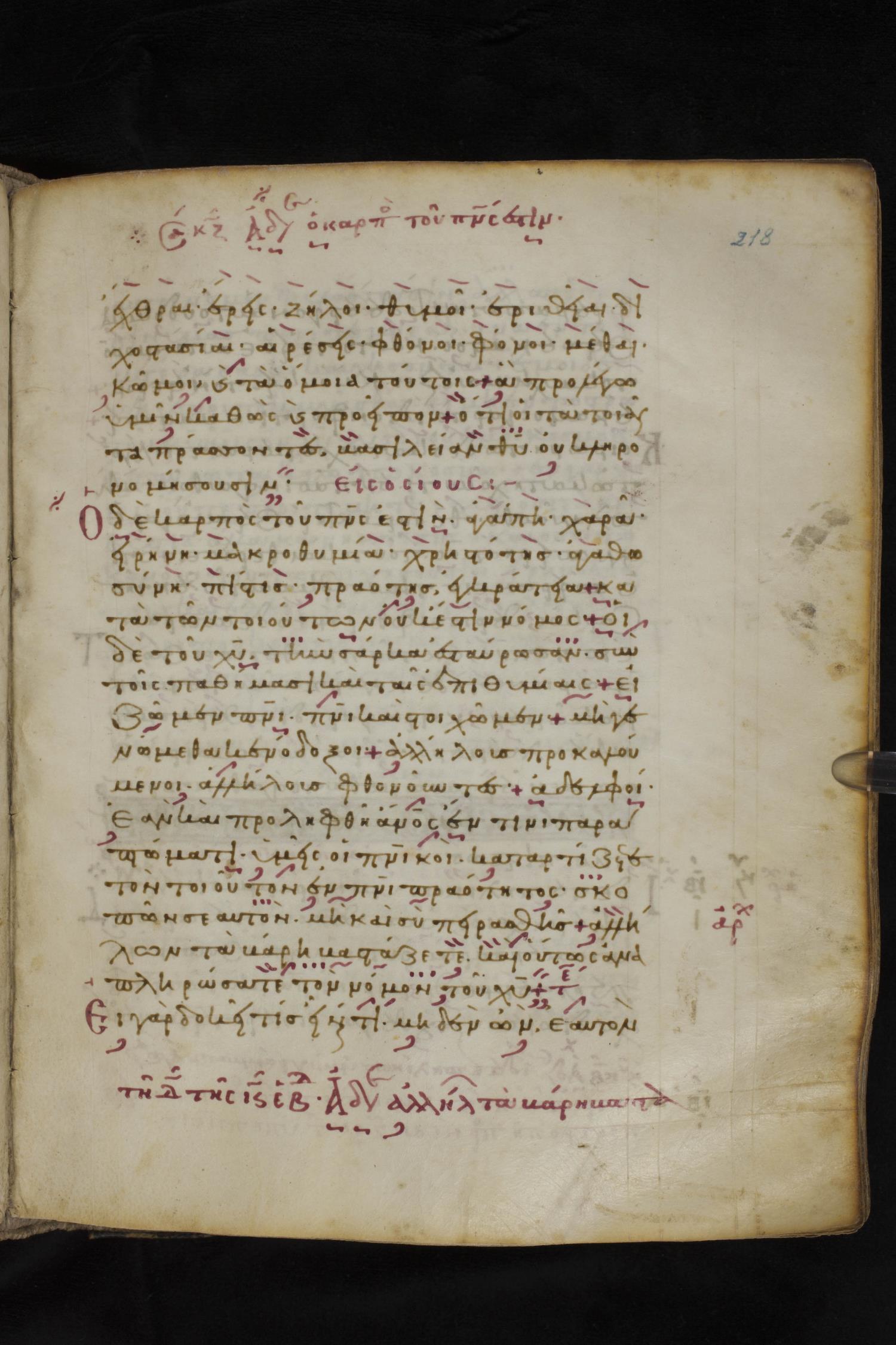 Eleventh century minuscule of the Apostolos, Paul, and Revelation on parchment; 327 leaves, 1 column, 22 lines per column. Images were taken at the National Library of Greece in Athens.