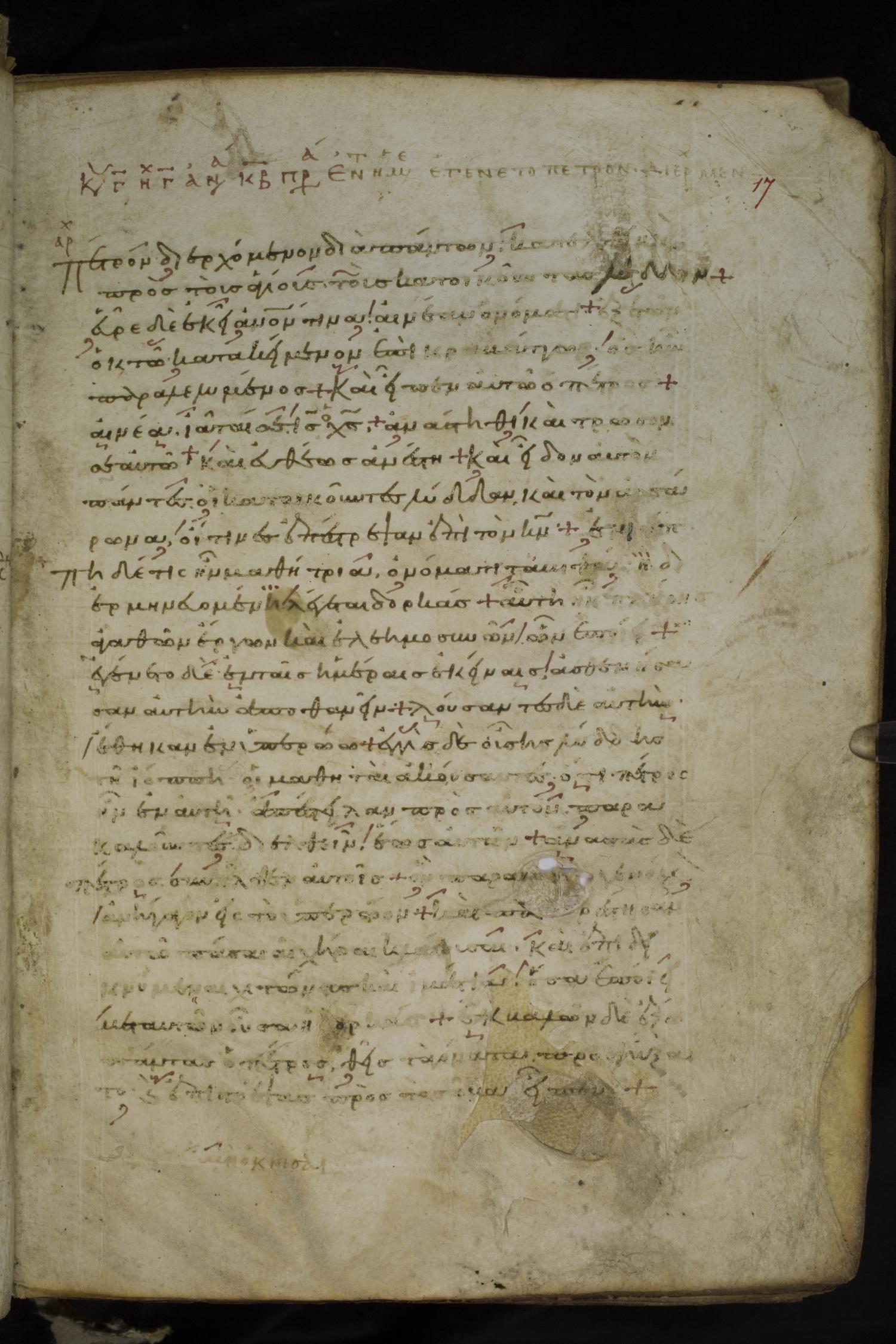 Tenth century minuscule of the Apostolos on parchment; 86 leaves, 1 column, 25-26 lines per column. Images were taken at the National Library of Greece in Athens.