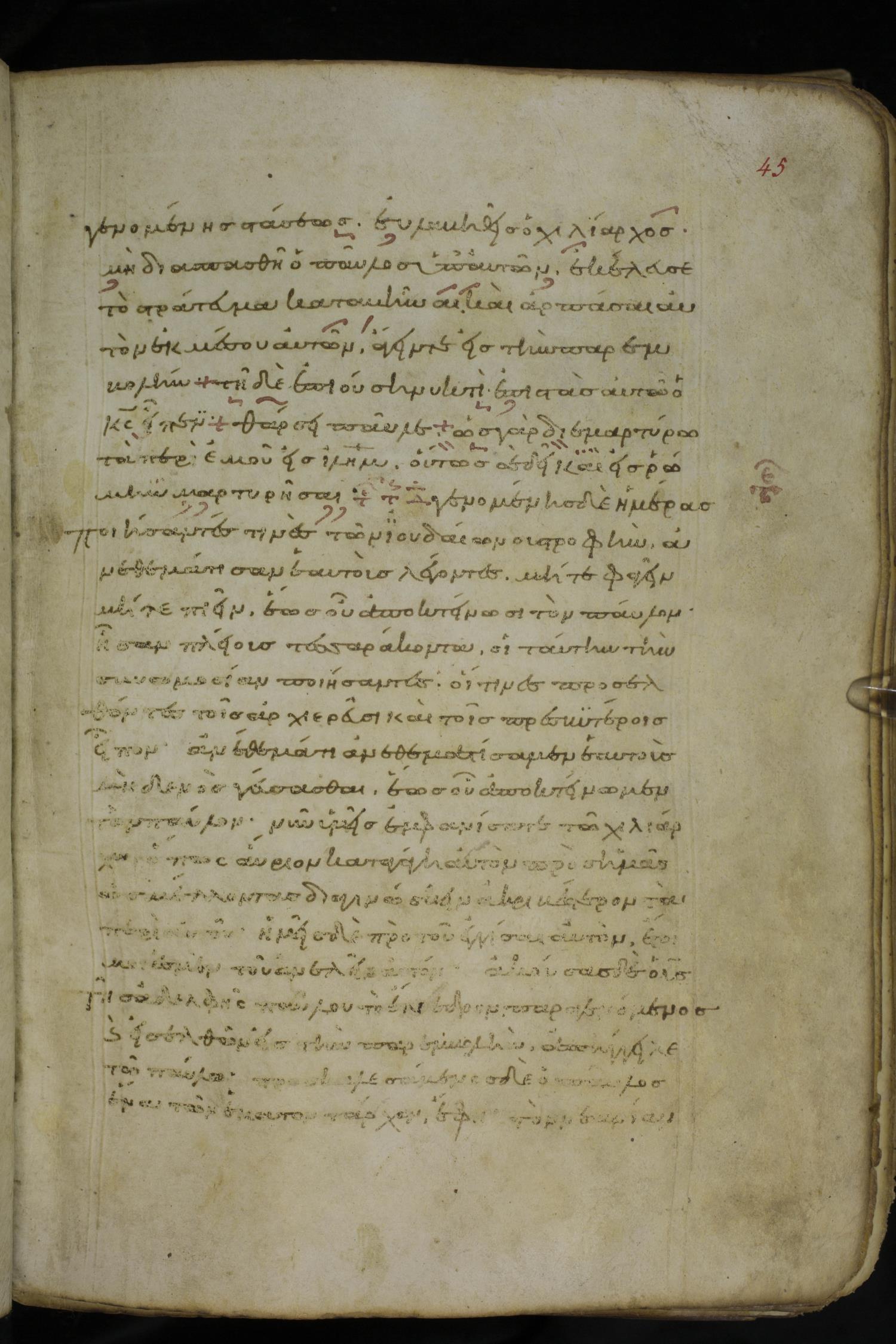 Tenth century minuscule of the Apostolos on parchment; 86 leaves, 1 column, 25-26 lines per column. Images were taken at the National Library of Greece in Athens.