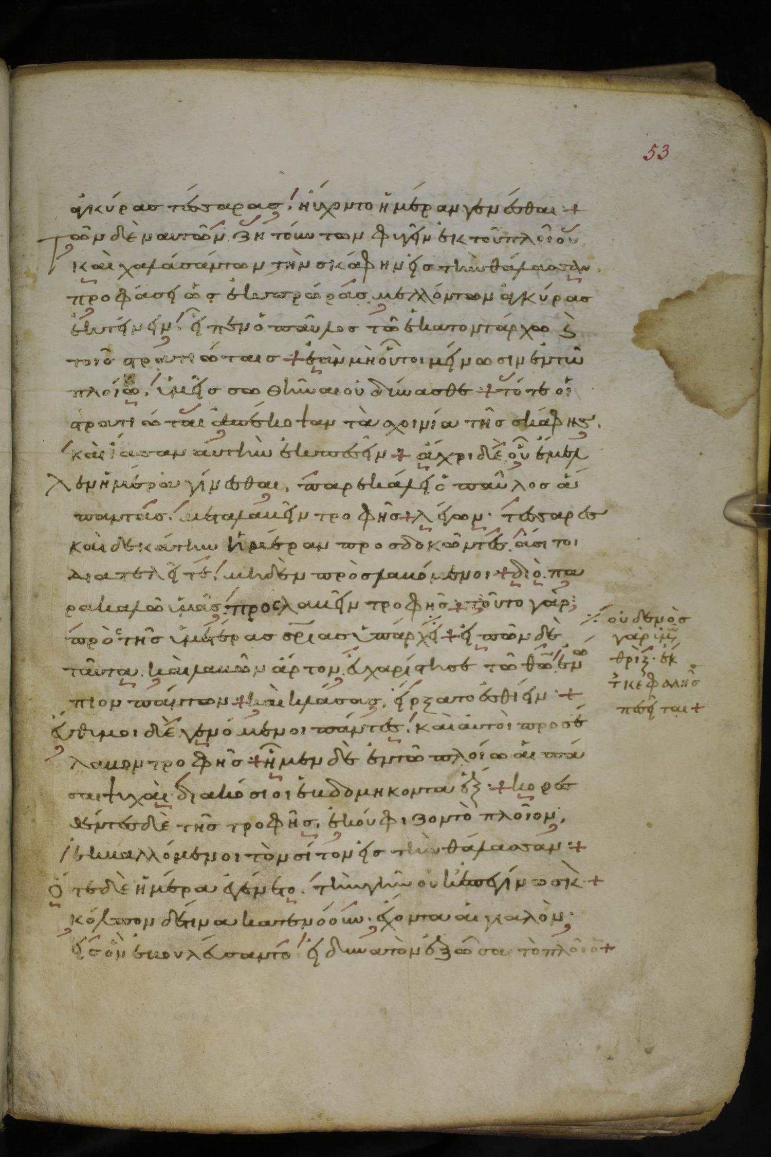 Tenth century minuscule of the Apostolos on parchment; 86 leaves, 1 column, 25-26 lines per column. Images were taken at the National Library of Greece in Athens.