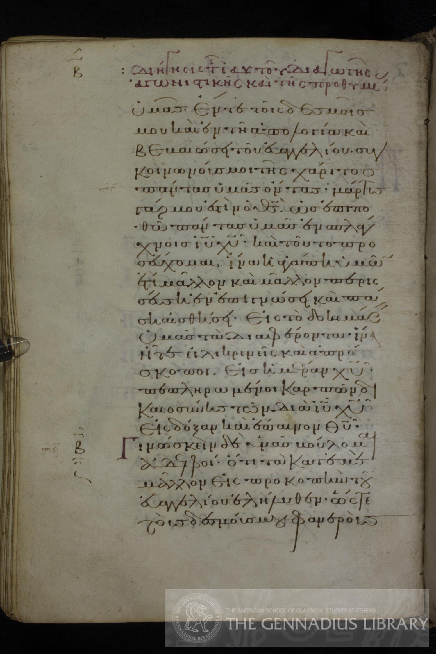 Thirteenth century manuscript of Apostolos and Pauline Epistles on parchment; 379 leaves, 1 column, 23 lines per column. For more information, please visit Gennadius Library