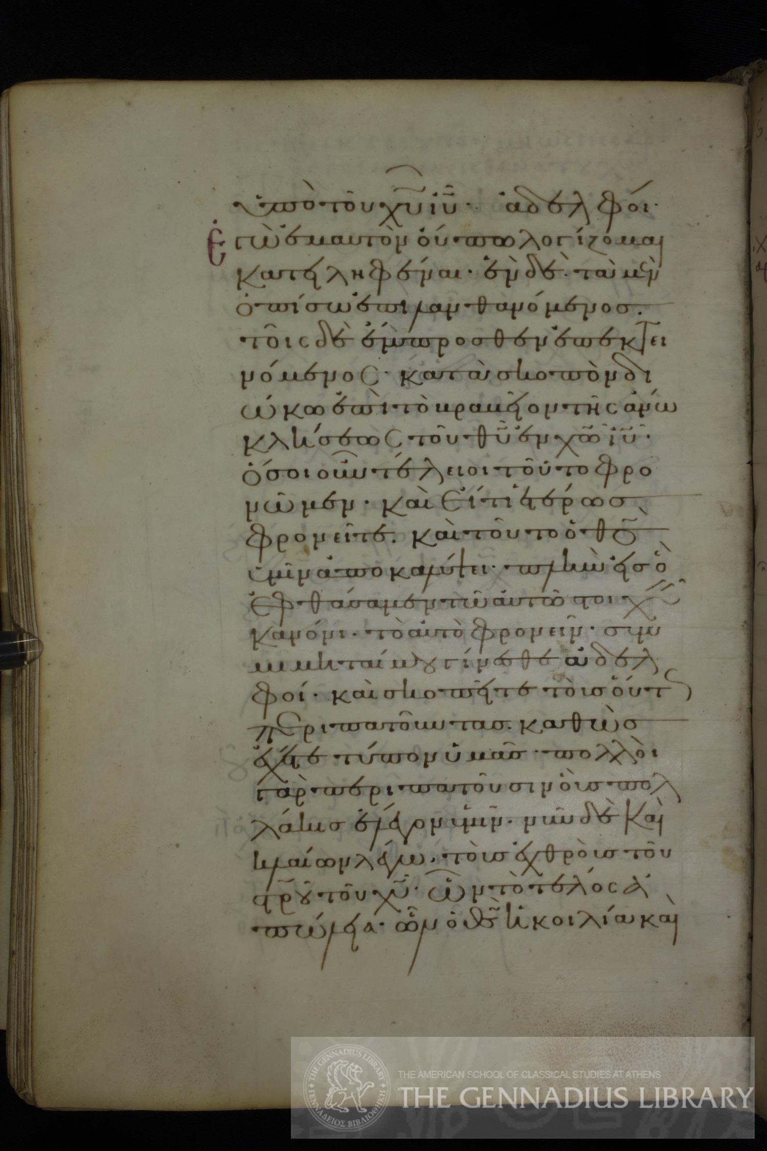 Thirteenth century manuscript of Apostolos and Pauline Epistles on parchment; 379 leaves, 1 column, 23 lines per column. For more information, please visit Gennadius Library